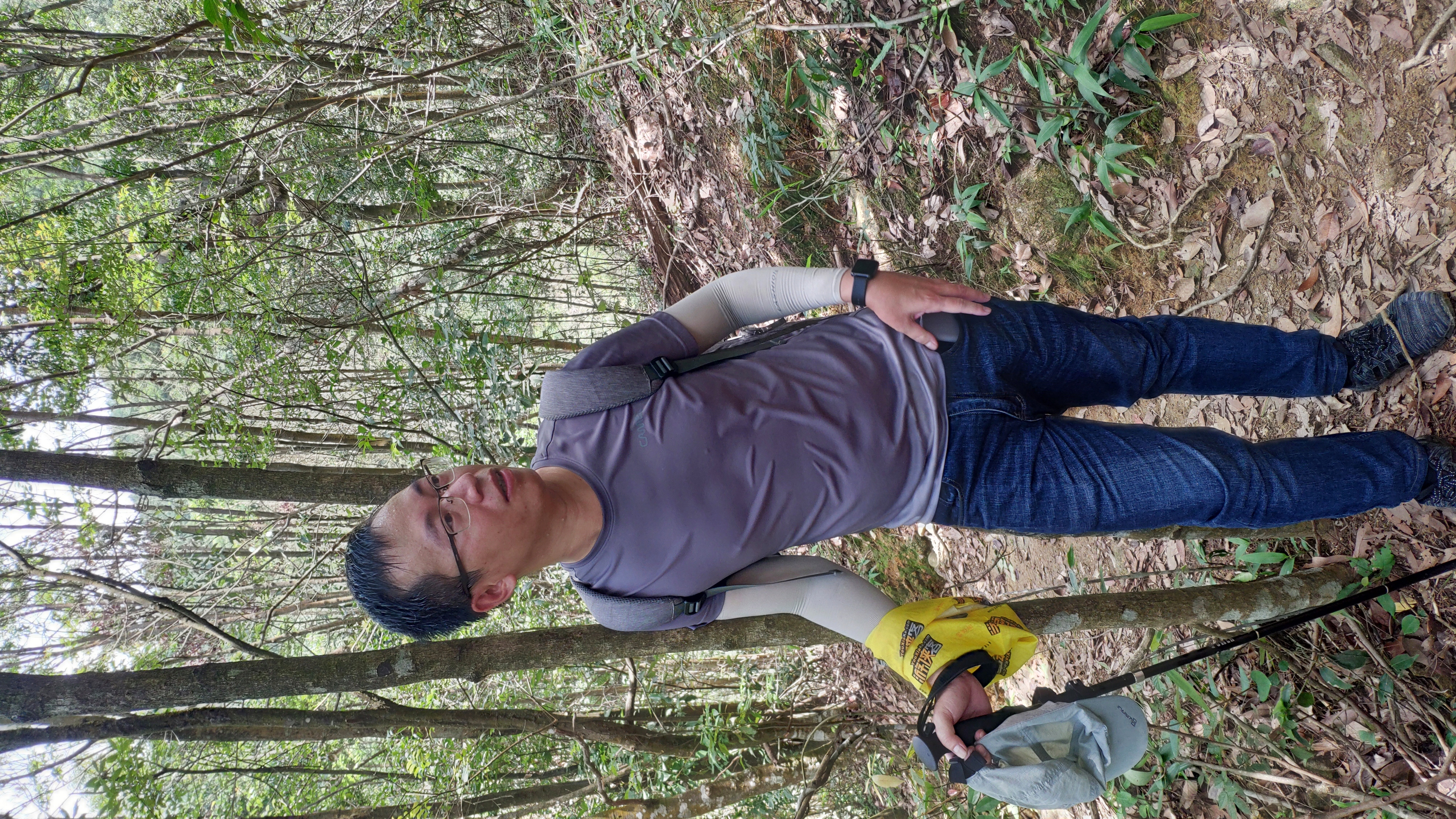 第二段:好了,重头戏来了,急升坡(其实还好啦,不算太难,不要打我哦)开始,大概一公里,爬升从540到900,在树林中行走,难度是有的,强度也是有的,这段的树是很高的,路也很明显,不会有什么阻碍,不会走错路,纯粹的陡,单纯的急升,调整好呼吸,按照自己的节奏,很好,这段小伙伴都走得很好的。不过,林子里面没什么风,温度也是有那么点高,所以,湿身就在所难免啦(看看下面照片中那哥们,嘿嘿)。
