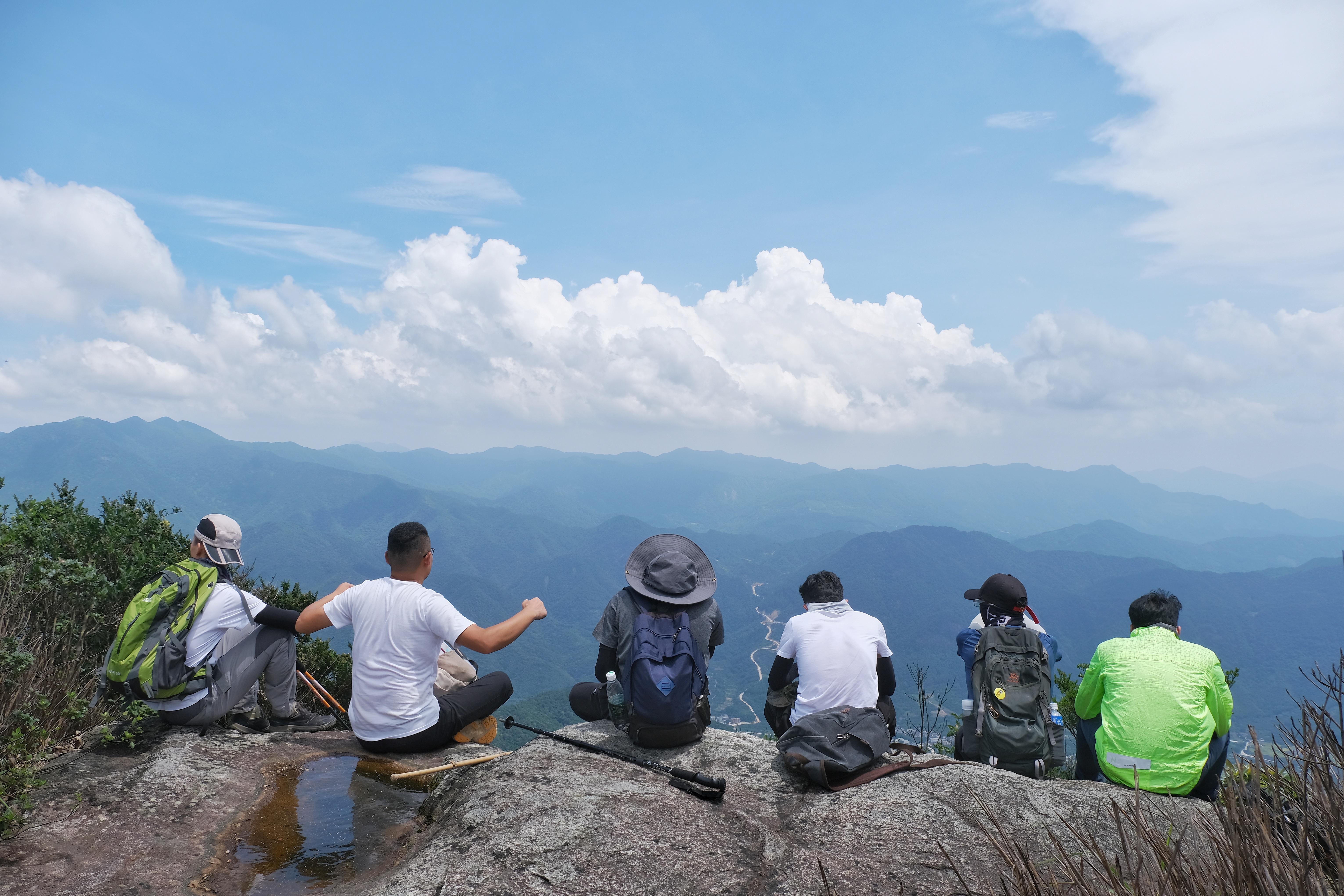 爬升结束,犒劳下自己,找了个开阔地,大家伙儿开始分享水果/食物,鸡腿、肉、糖水、糯米鸡、粽子、面包...青瓜、葡萄、圣女果、枣、苹果、梨,,,竟然还有小西瓜,过分了啊