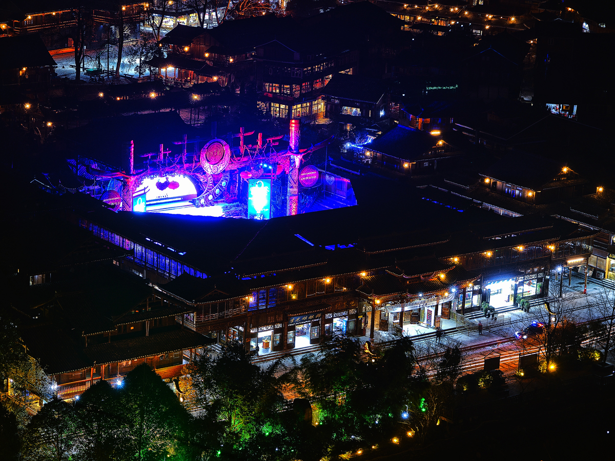 我们在这个观景台一直呆到晚上,因为晚上的夜景也是超乎想象,一个个吊脚楼里陆续亮起了灯,星星点点,非常漂亮,有一种诗意般的美妙。整个苗寨呈现金黄色的繁华夜景象。这里这里也是摄影发烧友最喜欢驻足的地方。