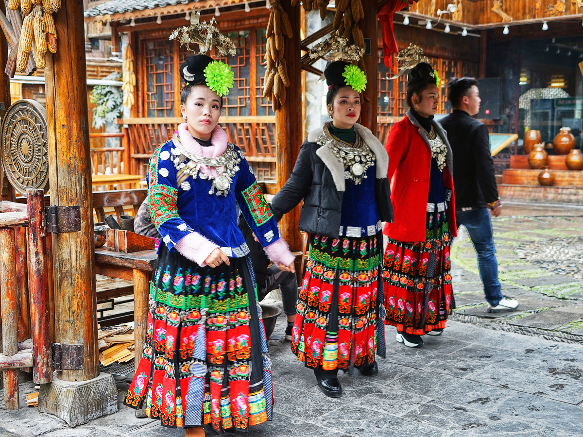 岜沙 女子着装也极为精美,衣裙上古香古色的刺绣图案,配以银项圈、头饰,手镯,十分耀人眼目。