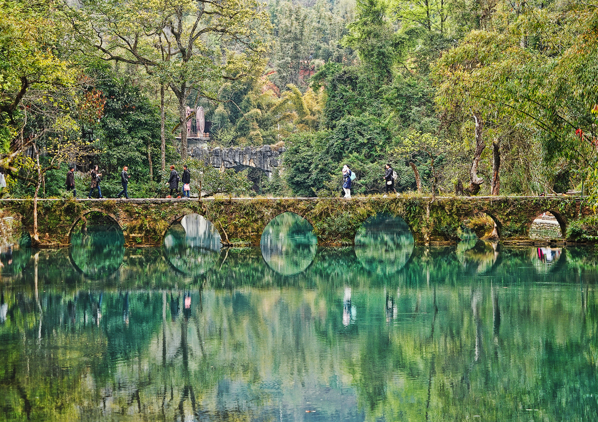 小七孔景区以东区内小巧玲珑的七孔古桥而得名。这里各种树木盘根错节,各种飞禽栖息其间,奇花异卉俯拾即是。低头则绚丽多彩的一大片湖面呈现在游人眼前。多彩的湖面上亦有多彩的树木反射形成的倒影美景,瞬息多变,百看不厌。我们也在此百拍不烦啦。