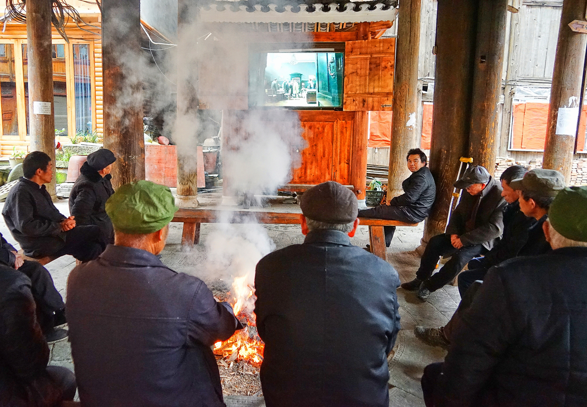 天色渐渐暗下来的时候,寨子里的一些店铺就会点亮自家牌子,街上渐渐热闹起来。吃完晚餐游客们有被房东邀请去参加当地的篝火晚会,吃到了当地的香猪肉,喝到了他们自酿的糯米酒,围成一圈下唱苗家祝歌。我们则四处转悠,看见鼓楼里聚集一些侗寨老人有的在看大电视,有的在聊天,我们老Y也重在参与---与他们聊聊不曾知晓的民俗民风……