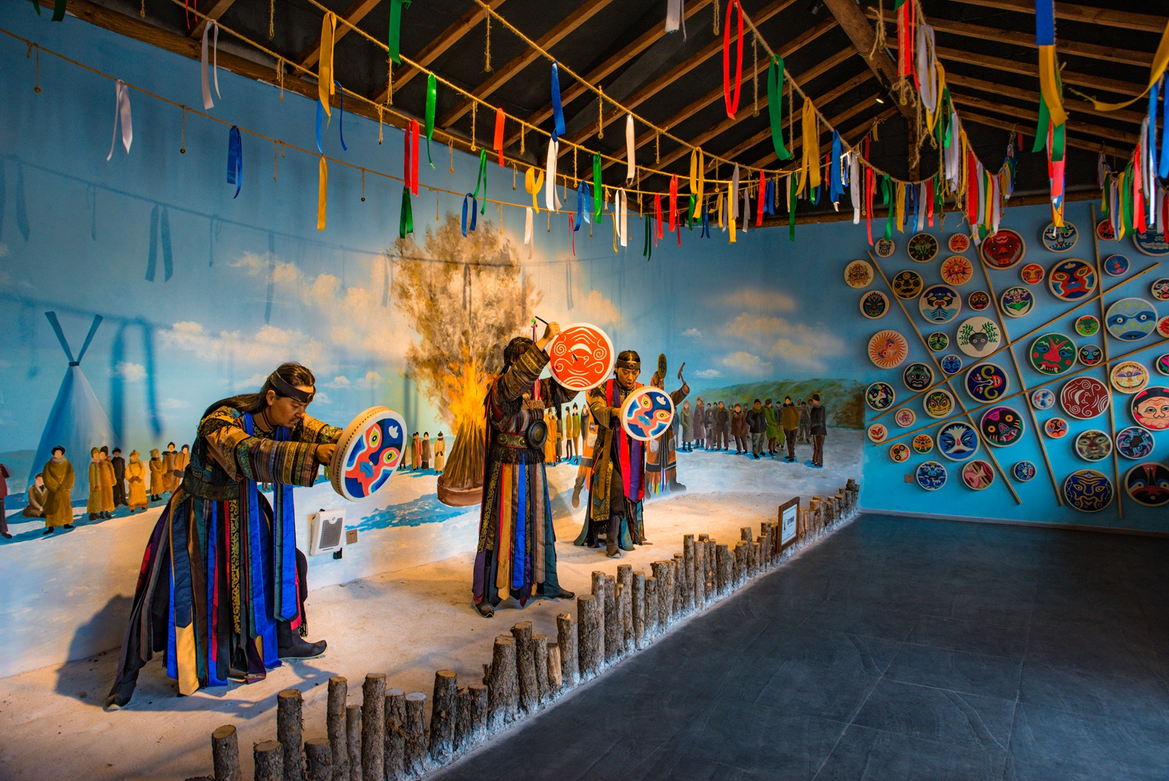 展馆五:满族的宗教文化展示,主要展示满族的宗教信仰(萨满教),对自然的崇拜(山神、火神、风神、雨神),图腾的崇拜(虎、鹰、鹿)。