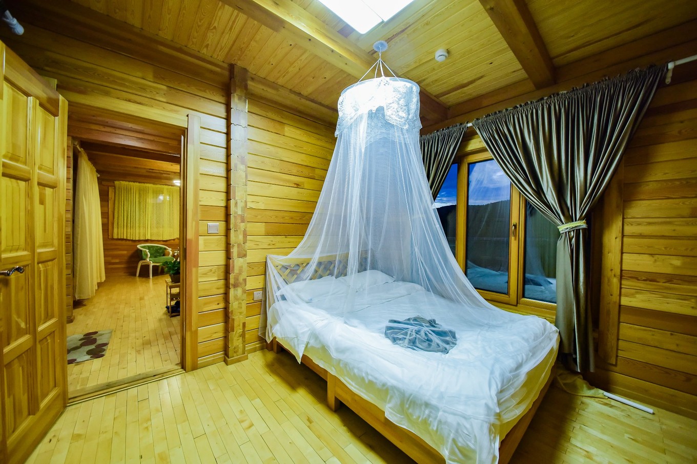 住的木屋名副其实都是木质做的,只是空间不是太大,真的山里蚊虫较多,每个床都配了蚊帐。清澈的湖泊上倒影着岸边的景色,微醺的夜色里,小屋也逐渐开了周围的灯光,犹如一个一个镶着红边的红灯笼一样。轻轻踩着木板小路,一声声踏着木板的声音在这寂静的傍晚中显得格外的清脆,眺望着远处的湖泊和 大兴安岭 的森林,这样集聚草原,河流,湿地,原始森林的自然景观在这温馨的夜色之下,看起来是那么的美。