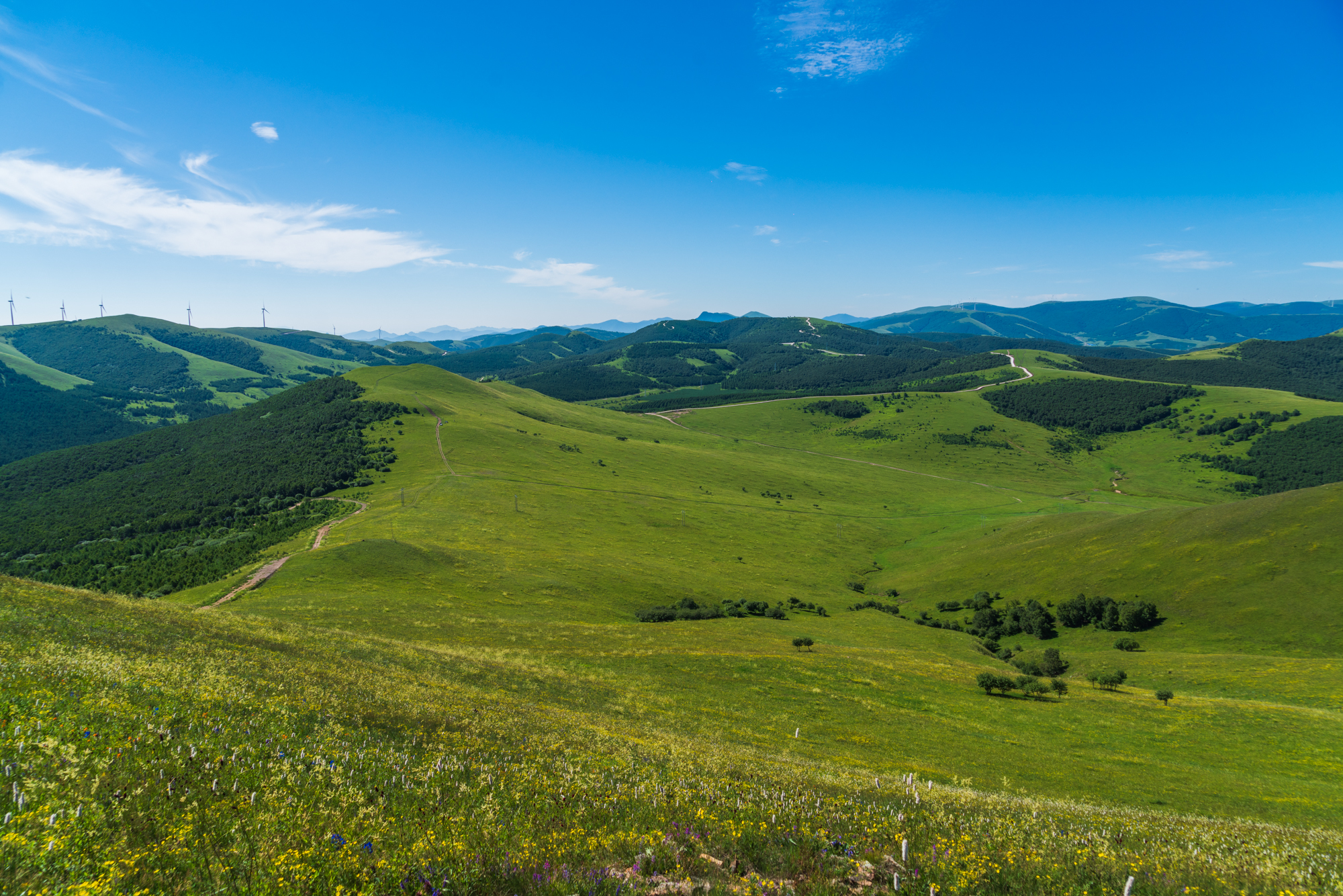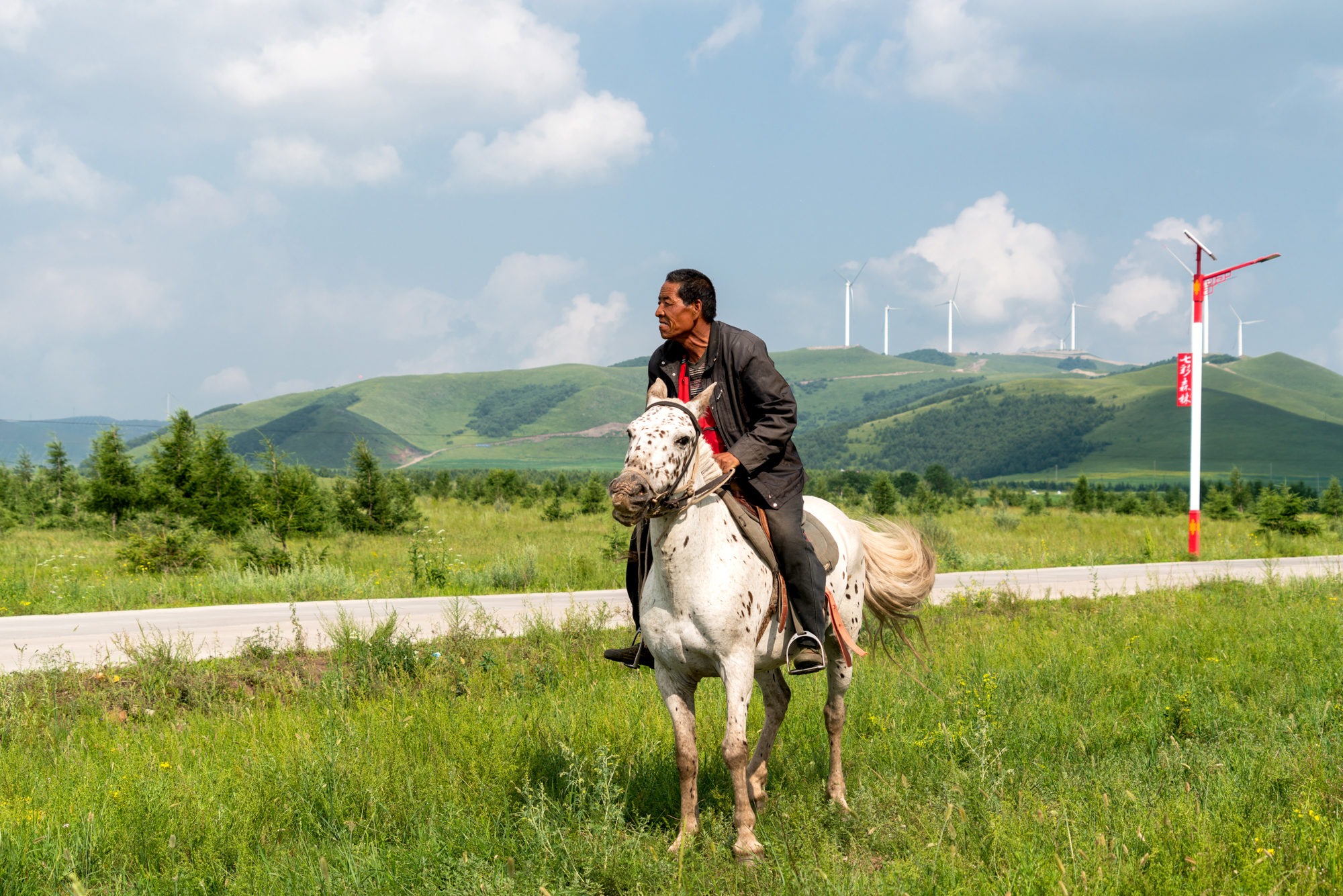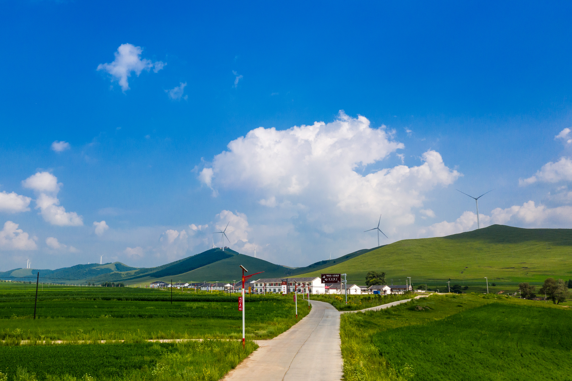 景区大门入口前,是一条长长的水泥路,水泥路在中间分了岔,一条通往景区入口,一条通往七彩天路,两侧都是绝美的风景。移步易景,步移景易或许说的就是这里。这里天的蓝的,云是淡的,青青草、碧云天,舒缓的山坡,慢悠悠的转啊转永不知疲倦的风力发电车沿着山的走势从这头通往那头,形成了壮丽的山河画卷,让人忍不住停下脚步,踏马而行,一路欢歌。