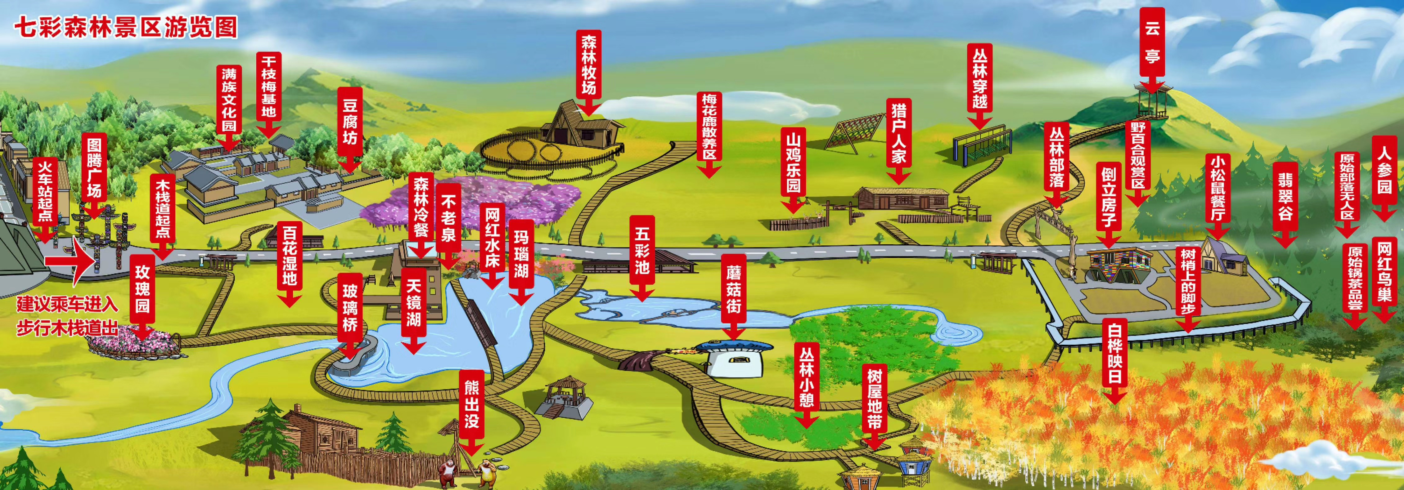 乘观光车→丛林部落车站→云亭→猎户人家→树尖上的脚步→丛林穿越→原始部落无人区→翡翠谷→网红鸟巢→白桦映日→树屋地带→五彩池→森林牧场→梅花园→玛瑙湖→不老泉→熊出没→天镜湖→玫瑰园→意径→满族民俗展→游客中心