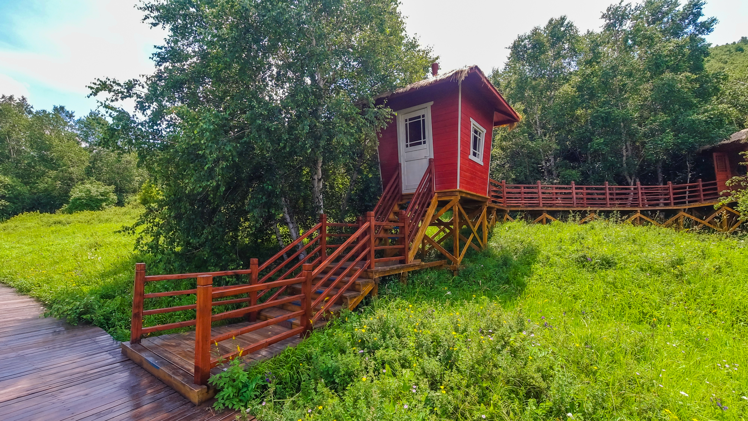 七彩森林,当然不能少了卡通色彩,在木栈道的沿途,还设有许多小环节,比如小白桦映日、树屋、蘑菇街都非常适合拍照合影。