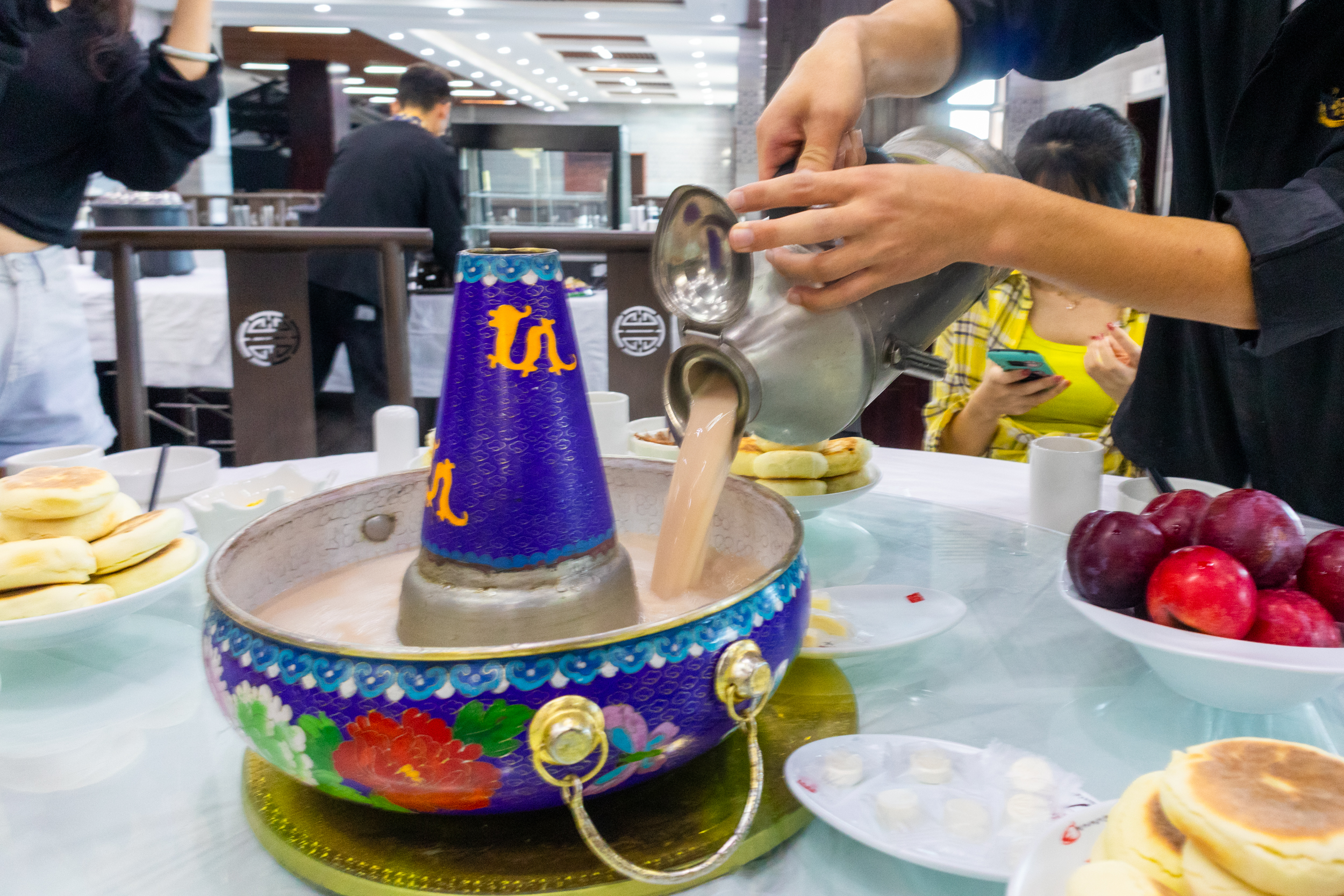 一大锅锅茶,搭配上各种各样的专属茶点,口感浓香醇厚的锅茶,浇在点心上上,泡着茶点,满满的一大碗,热乎乎的喝下去,很舒服,味道令人难以忘怀。在我这里的美食排行里,锅茶的地位不次于烤全羊,一个资深吃货能对其作出如此之高的评价,可见味道如何。