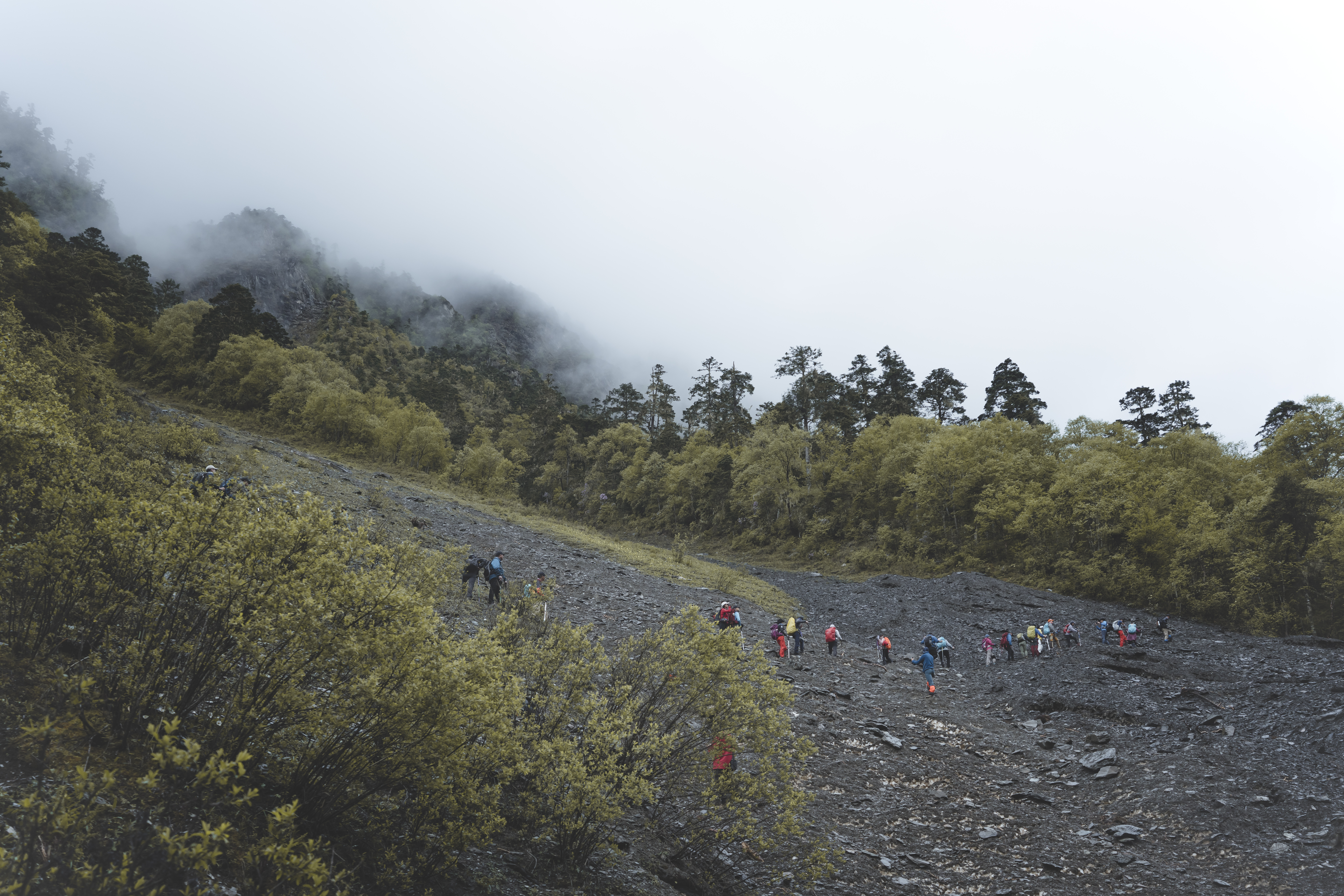坡均出发,伴着山间弥漫的浓雾,沿碎石坡一路爬升。一周前朋友走这条路时,还是没膝的积雪,一周后冰雪就已融化。石缝间的涓涓细流,经过几千米海拔的跋涉,汇入山下汹涌的 三江 。逆向做功的我们,也经过几千米的跋涉,克服重力,才踏上这融雪的源头。
