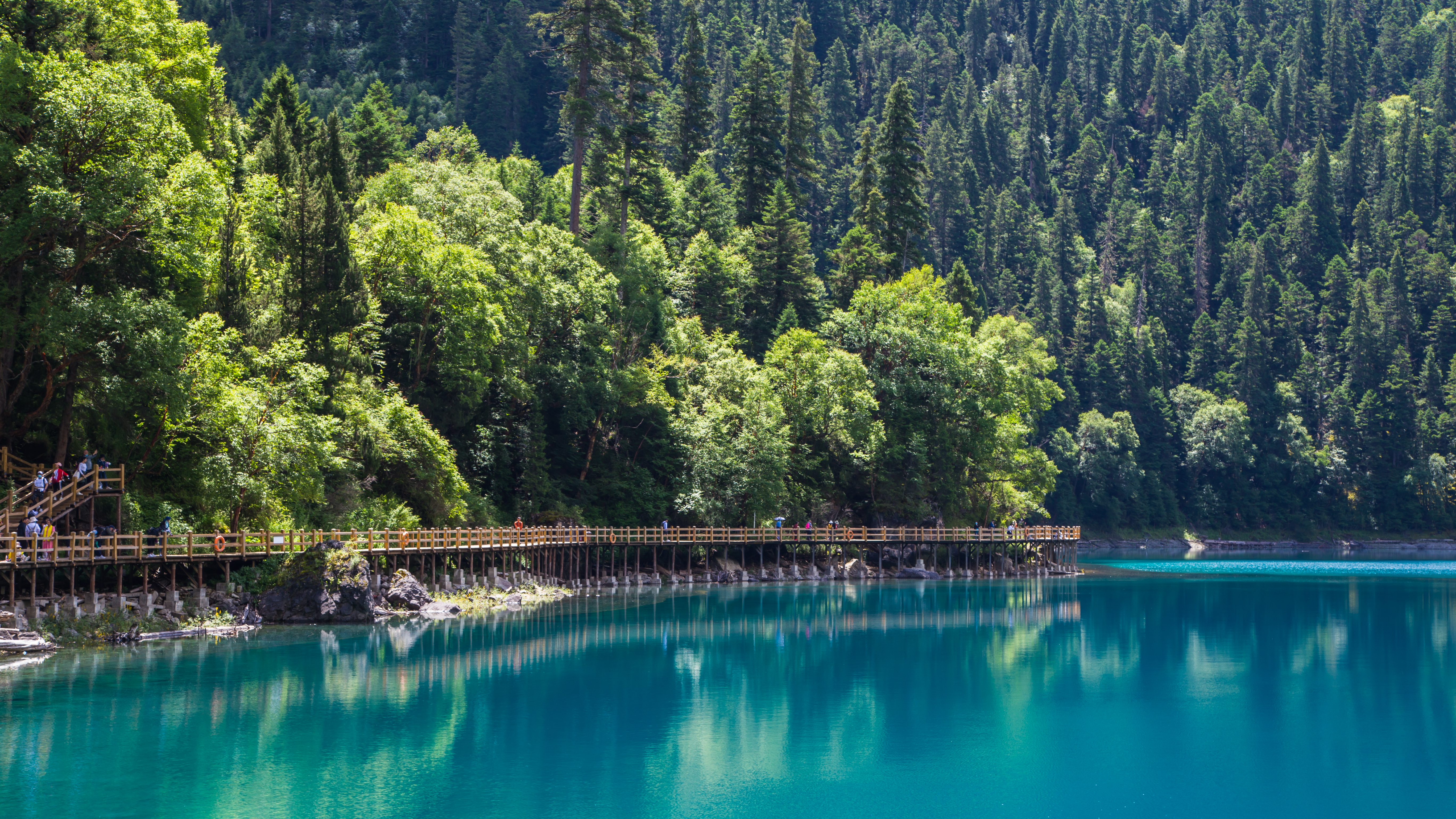 孔雀河道是从五花海出水口到大小金铃海之间的一条河道。漫步其中,就像是走在一副最浓烈的色彩创造出来的油画里,周围的风光犹如孔雀羽一样,将尘世间最美丽的蓝和绿都融合在一起。