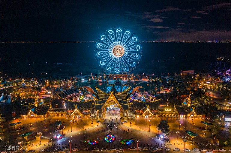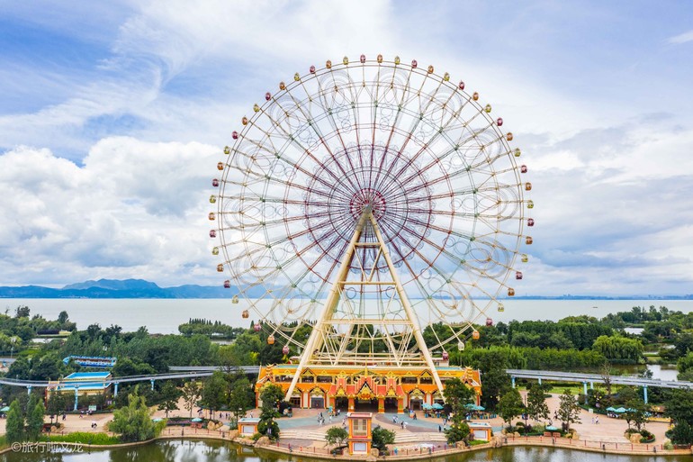 高108米的摩天轮,创了几个第一,全程大概21分钟,必体验。晚上灯光亮起更漂亮。可同时乘 坐336人(6人/箱,共56箱),设备以云南标志性动物——“孔雀” 进行主题元素提炼包装,作为项目 标志性游乐项目。游客可通过乘坐摩天轮欣赏波光粼粼的高原明珠“ 滇池”风光,更可观看七彩云南古滇名城度假区全貌。