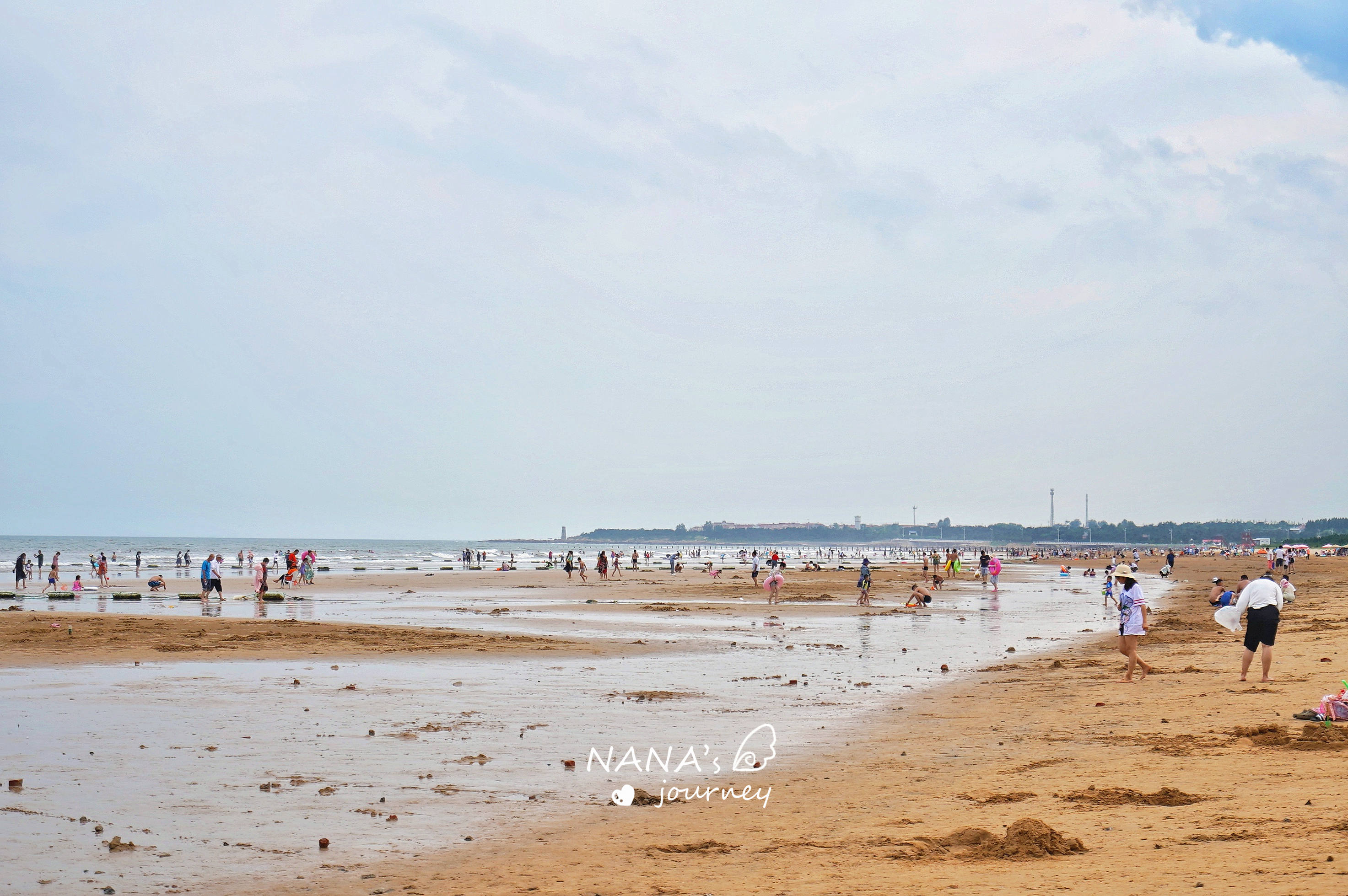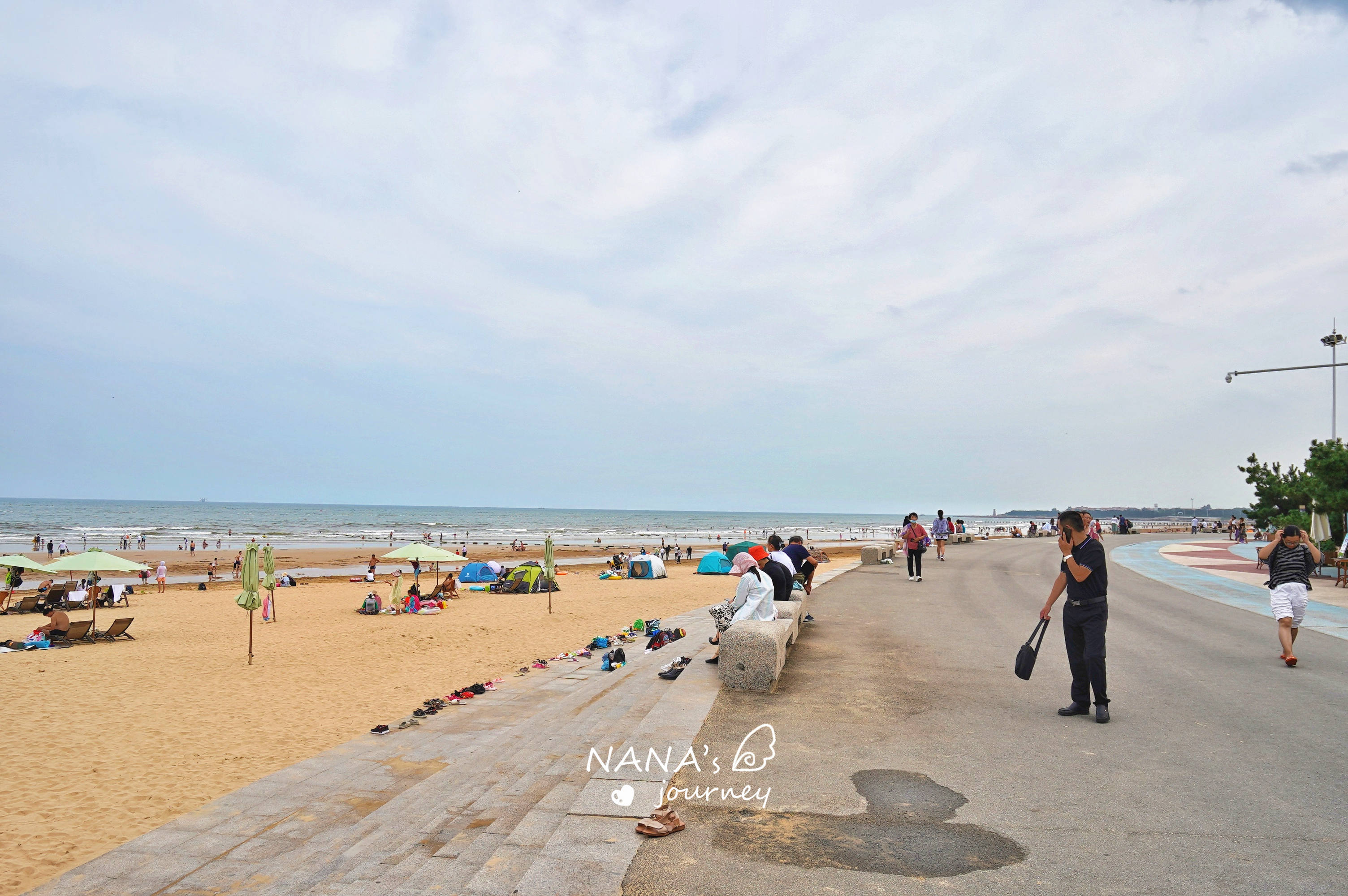 热闹的沙滩另一侧是更为平坦的沙滩,那边人比较少,后来我们才知道,那里的沙滩被征用了,怪不得更加的平静,偶有几个人踩着浪在散步。