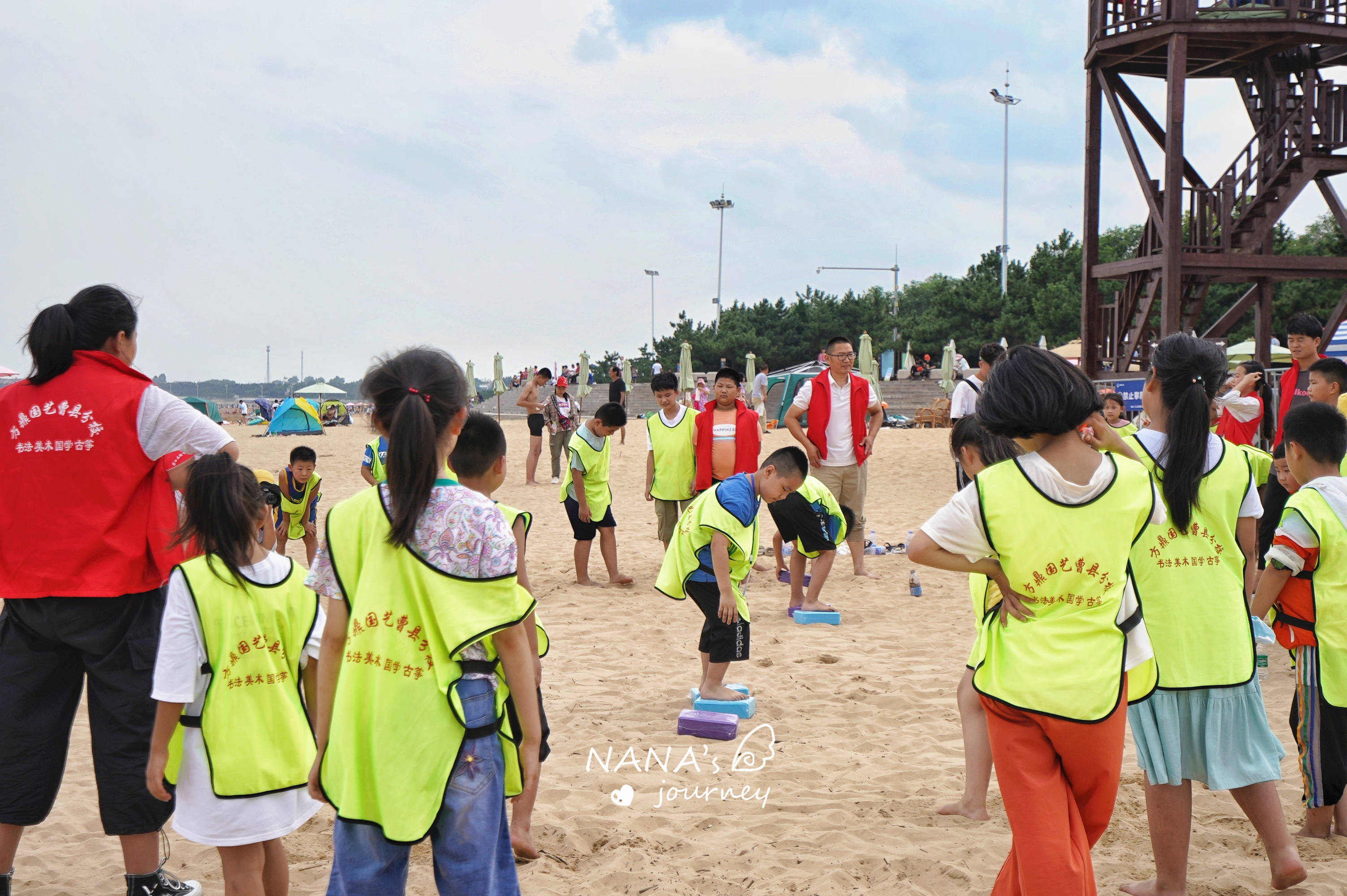 一些夏令营,组织来这里活动,许多小朋友们在沙滩上玩着拓展团建活动。
