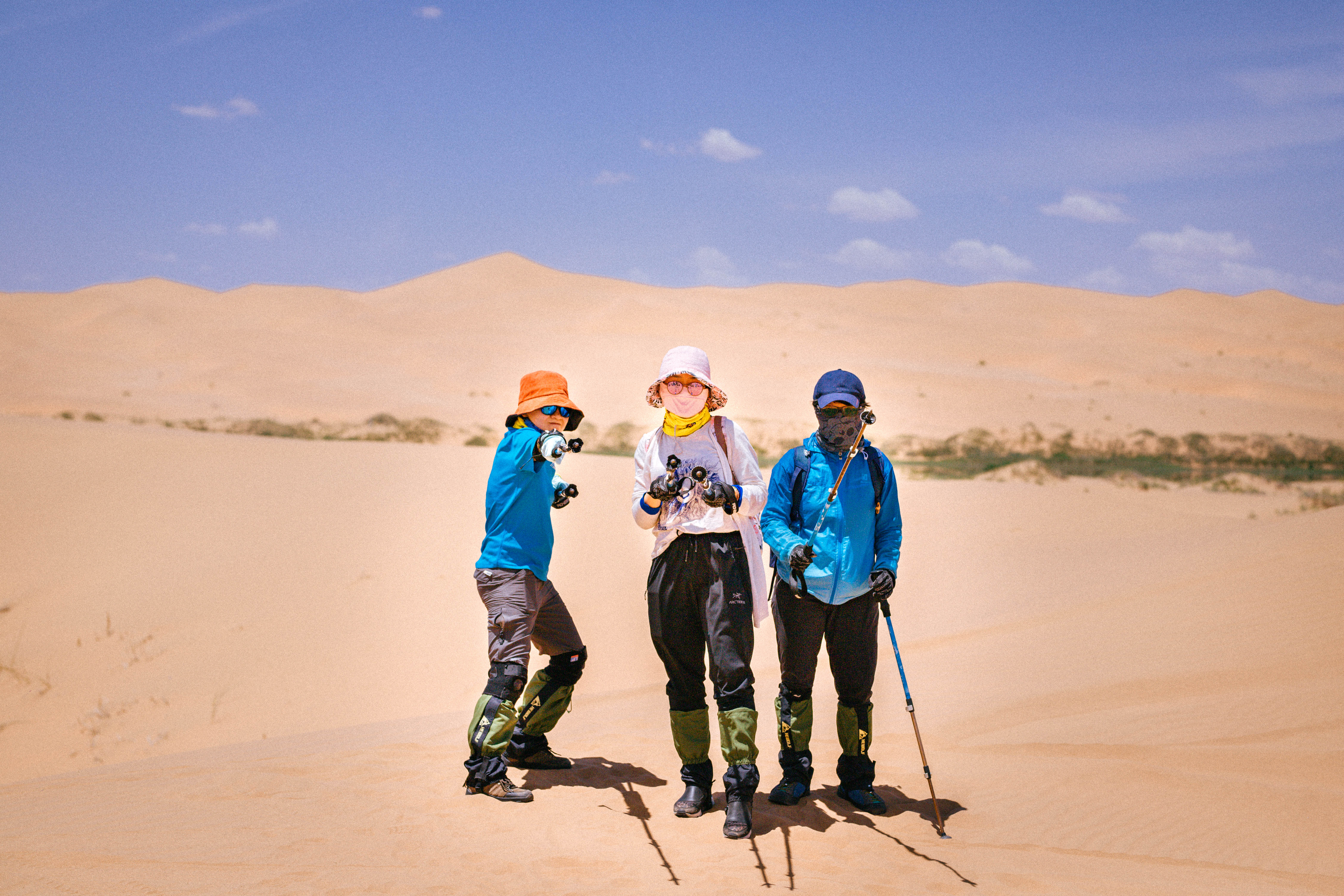 刚走完的路是比较轻松的,接下来就真的要往沙漠深处走喽。翻过几座沙丘,走在沙脊上,沙子比较吃力,所以我们要好好拉伸一下~~我们此次的领队是专业又高大帅气的吉祥老师。他们这波人与沙漠打了10多年的交道,又拥有丰富的专业知识,真的为这趟旅程增色不少。