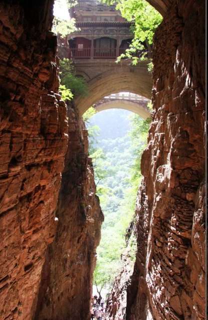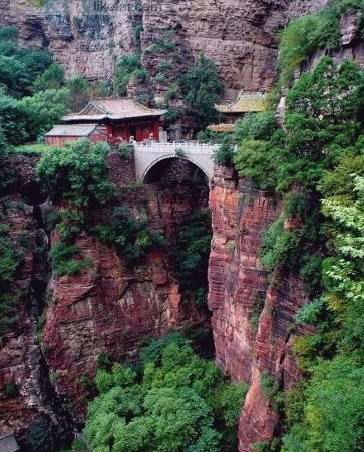 苍岩山位于河北省石家庄市西南50公里,地处井陉县境内。苍岩山海拔并不高,只有1000余米,但其气势却足以令人惊叹,一是山体的颜色通红,给人强烈的视觉震撼,二是其峭壁平整开阔,险峻明朗之势非其他同等海拔之山可比。正因如此,此山才素来享有“五岳奇秀揽一山,太行群峰唯苍岩”的盛誉。但是苍岩山引人注目的还不止这些,其遍布山中的福庆寺古建筑群才是苍岩山的灵魂之所在,当然其中最著名的就要数《卧虎藏龙》中玉娇龙纵身跳下的桥楼殿了。