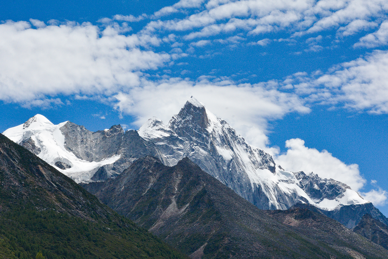 不远处,巍峨的幺妹峰正襟危坐,直指蓝天,非常有气势和魄力,像个“尊贵的帝王”。