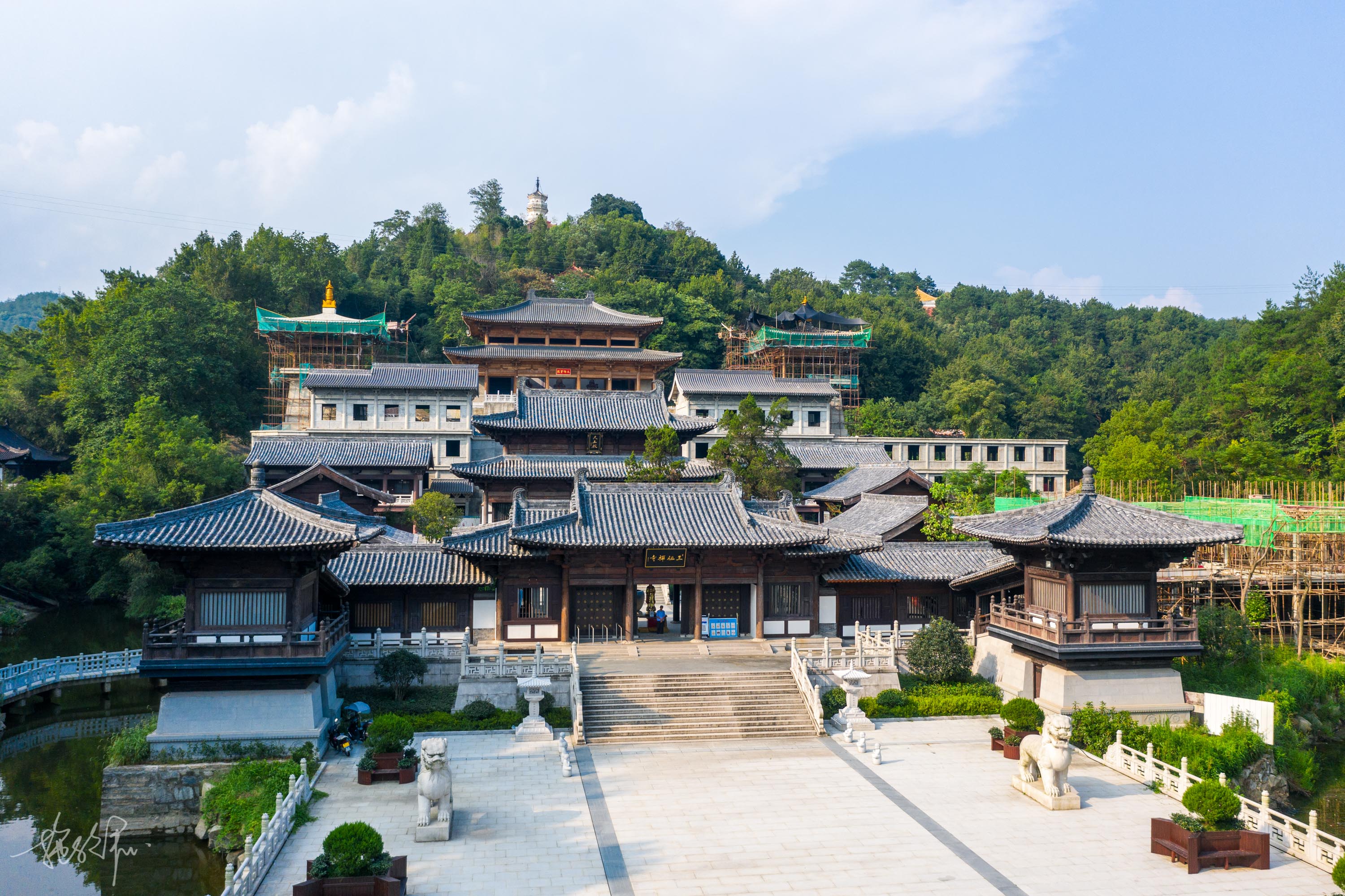 我们的车在三祖寺门口停了下来,眼前是两个巨大的玉麒麟雕像,三祖禅寺的牌坊特别气派。三门四柱冲天式的牌坊,用的是优质的青天石,“信心不二,不二信心”两句名言看着让人心有所想。