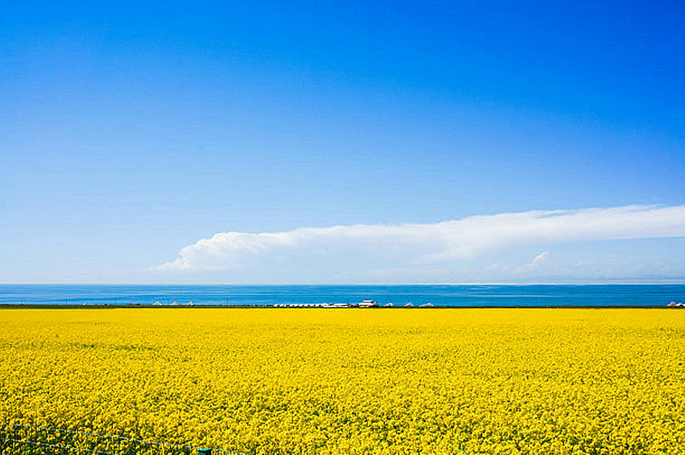 本来在这个时间段,已是错过了青海油菜花的最佳观赏期。不知是由于不同别处的独特小气候,还是因为主人特地比门源的农户晚种了几天,让我们遇到,得遂赏花心愿。黄澄澄的油菜花在视线里满满地铺散开来,蓝天碧水为其映衬、白云绿草为其点缀,犹如一幅绝美的油画。很多自驾游的朋友穿行在花海中,路旁的小汽车五颜六色,俨然成了我们这些只能在大巴车上欣赏者眼中的风景。