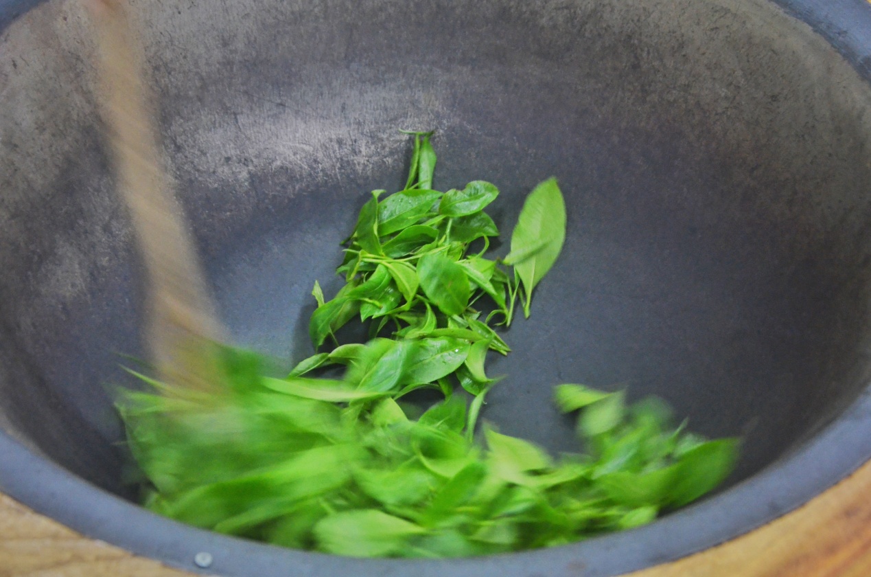 茶叶倒入锅中,火不宜过大,要不断的翻炒以免炒焦