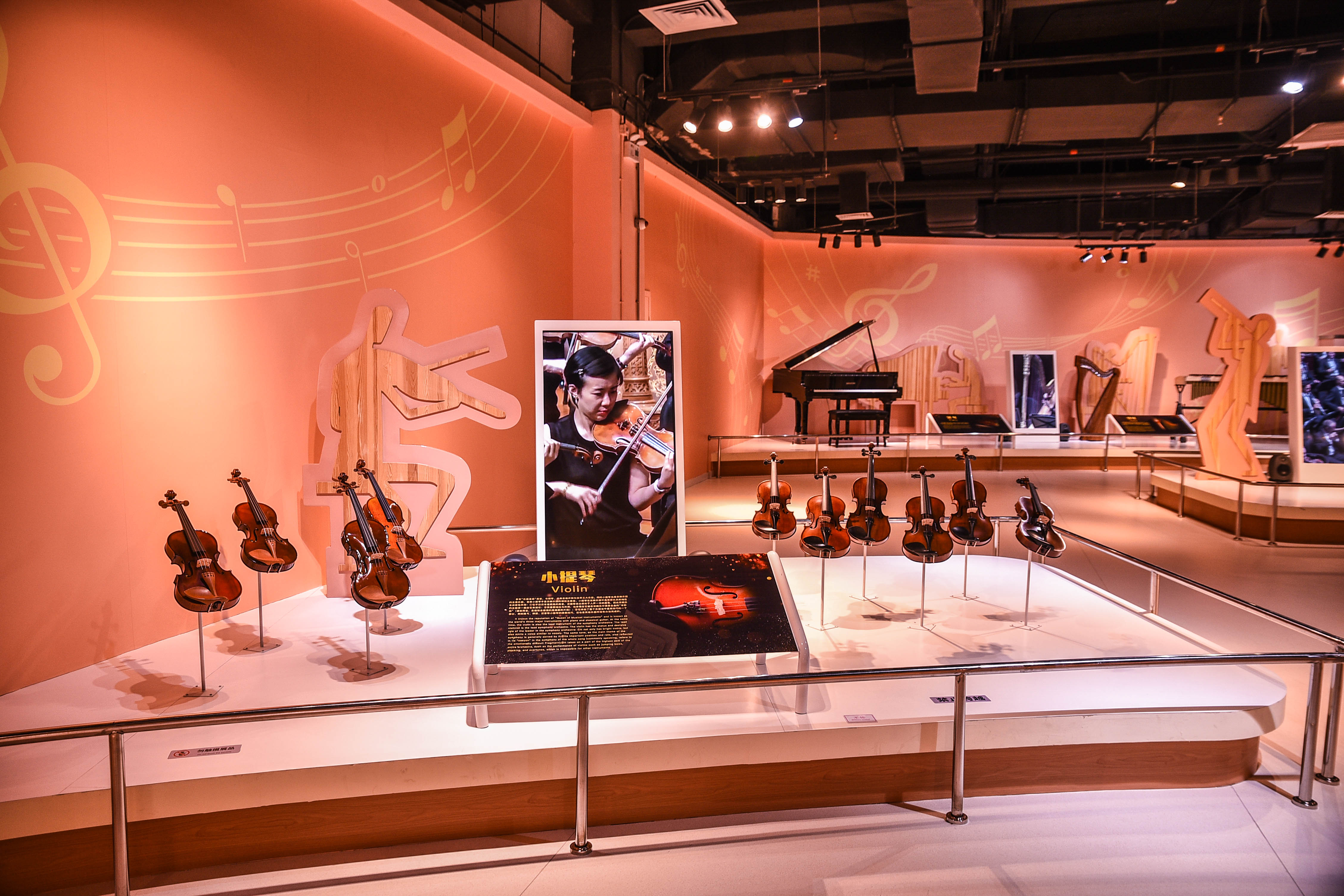 交响演奏厅里正播放贝多芬的《命运》,每一种乐器旁都设置了一块屏幕,走近就能清晰地听到乐器的音色,让观众了解到不同的乐器是如何在团队中发挥自己的特长。