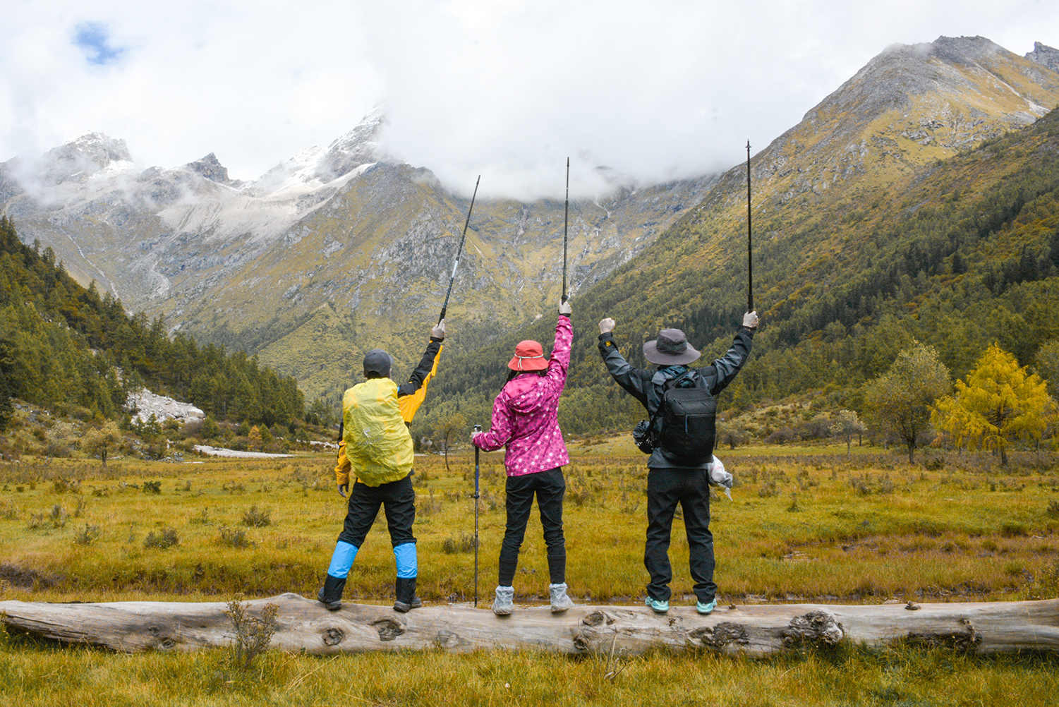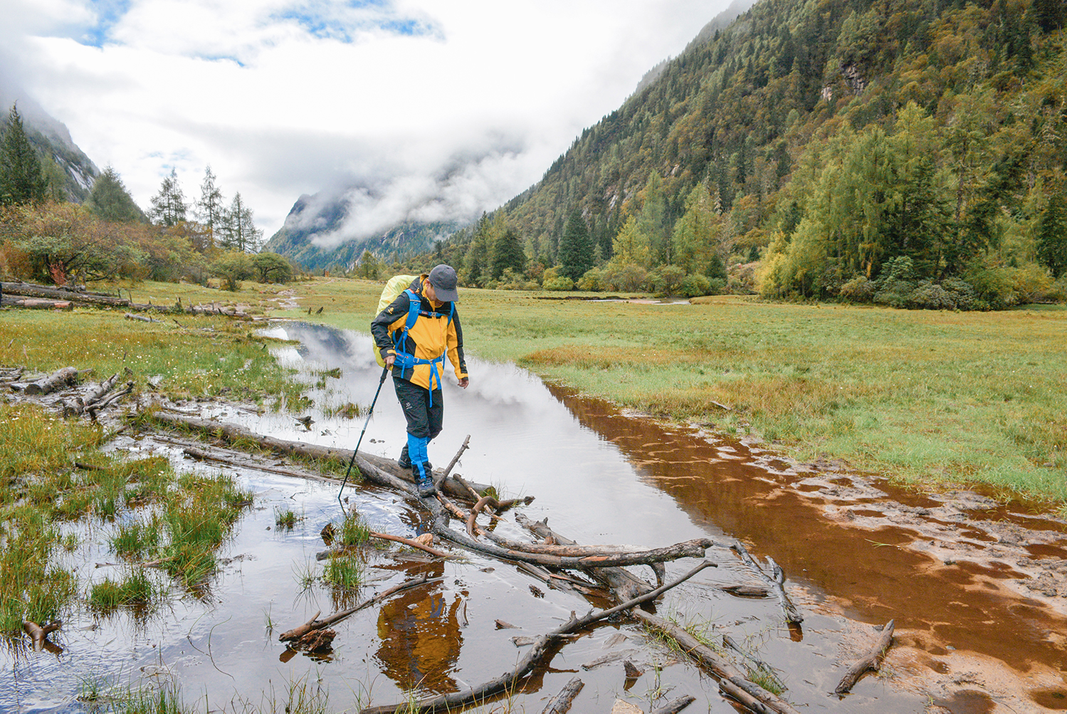 绕过最为泥泞的那段路,不一会儿一片开阔的草甸忽然出现在了我们眼前,近处溪流蜿蜒,远处雪山乍现,豁然开朗。见此美景,我们忍不住在此停留驻足拍照。