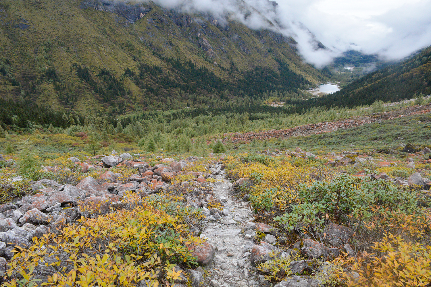 由于前一晚下了一整夜的雨,致使今日的路面积水泥泞。所以,我们不得不放弃了原本的“康庄大道”,从而选择绕路在密林间穿行。