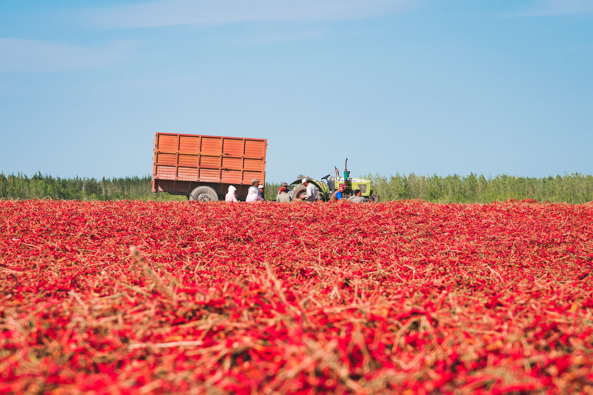 终于结束了晨雾这个环节,往回程走高速往安集海镇开去,沿路忽然闪现一片红色,正以为是没睡醒的的错觉,紧接着就是一连串的红色海洋向我们袭来,将车开近那红色的目的地,才发现是辣椒。