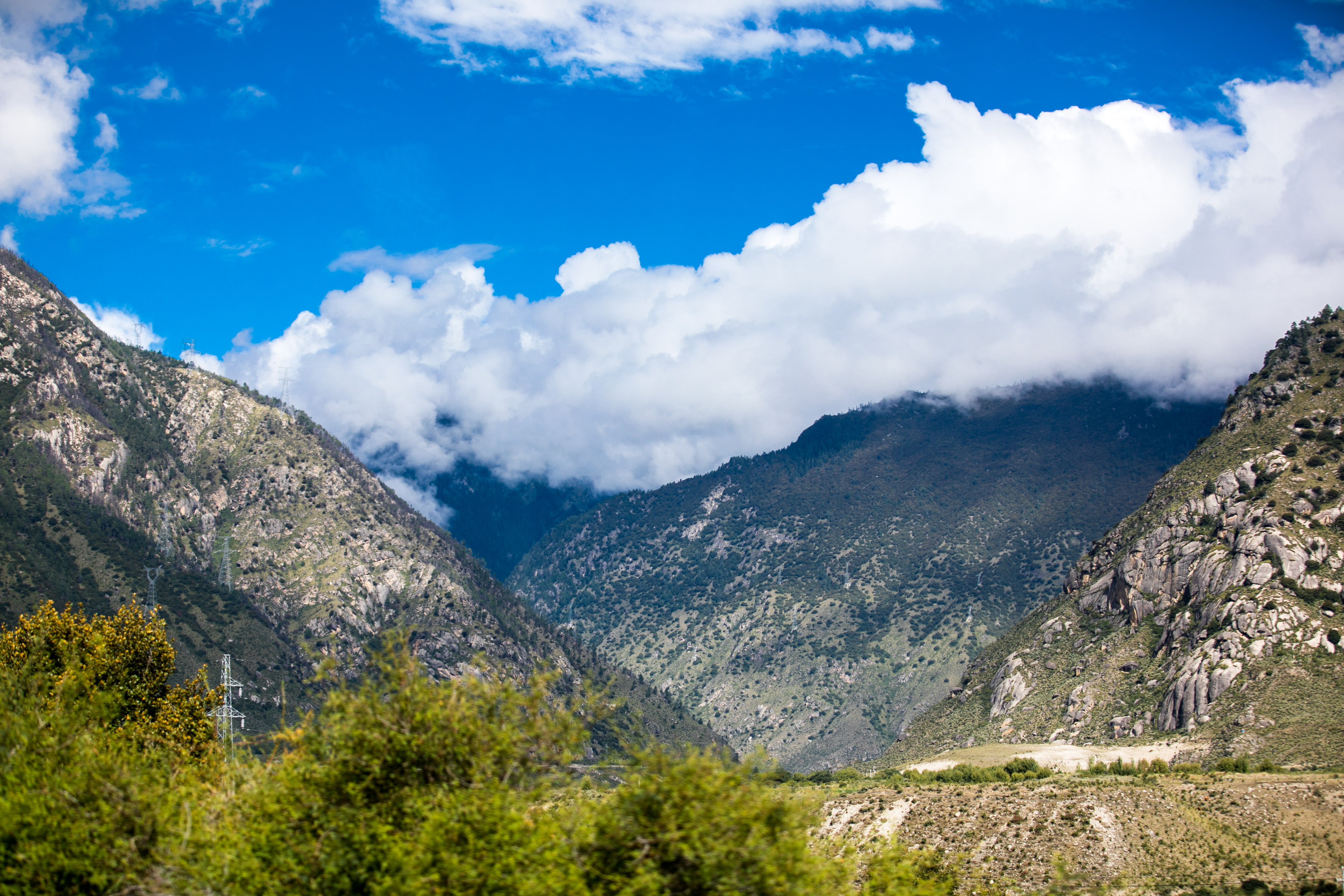 路上的天气特别好,车窗外是最简单最纯粹的蓝天白云。从玉麦村到麻麻村,是一段很长的旅程。驾车行驶在这里的公路上,野花野草野蛮生长,“青山随云走,大地沿河流”。