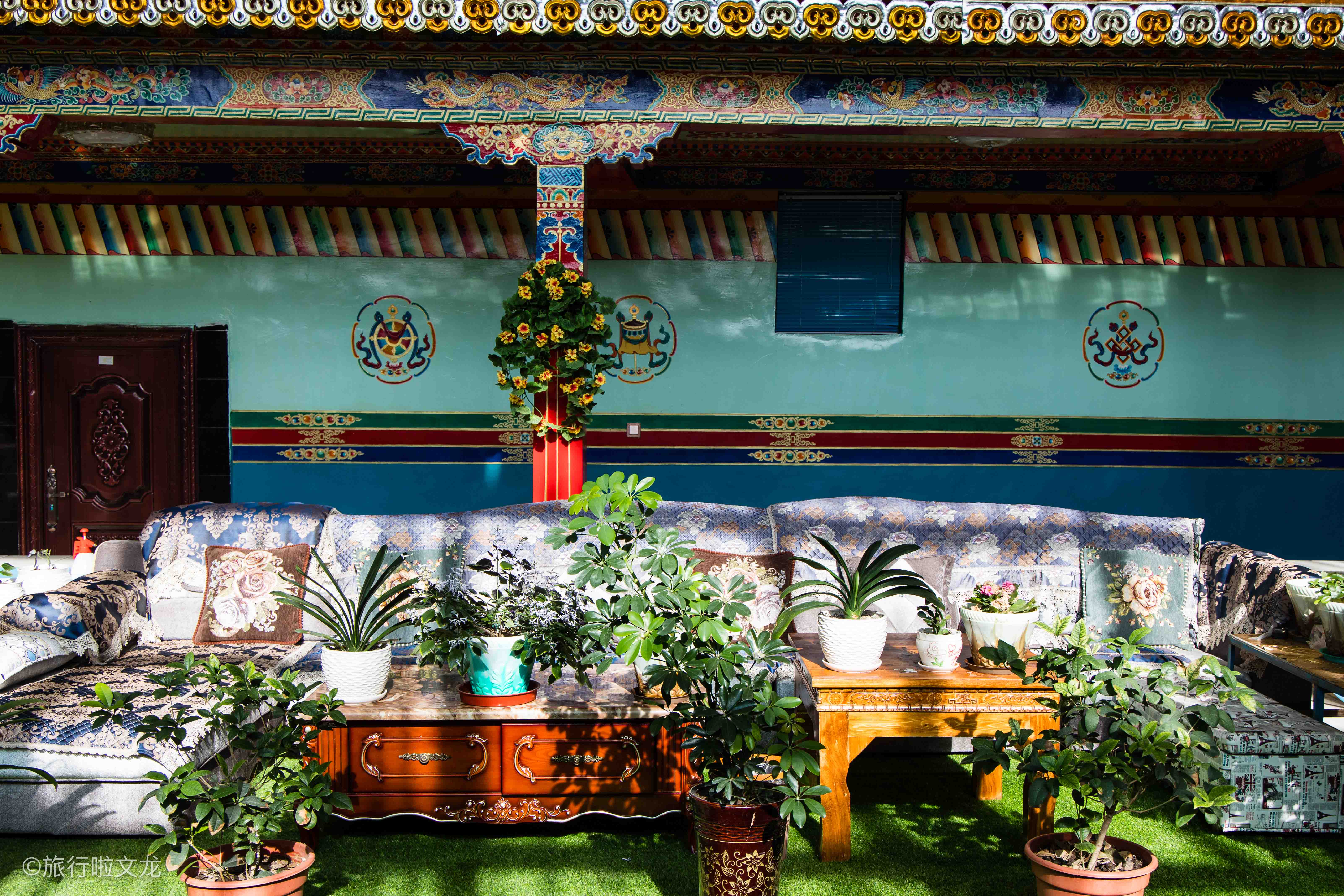 德吉藏家民宿里面的装修令我移不开目光,无论是墙壁上还是屋檐,甚至是屋顶的图案,都让我大吃一惊。图案是各种姿态的龙腾,在屋顶上墙壁上随处可看见的不同颜色的龙腾图案,非常的霸气和威风凛凛,即使是多种颜色的龙腾图案也不会感觉到繁琐,龙腾象征着吉祥,还有神圣的意义。龙腾的眼神坚定,总让我想花更多的时间去观赏和研究。