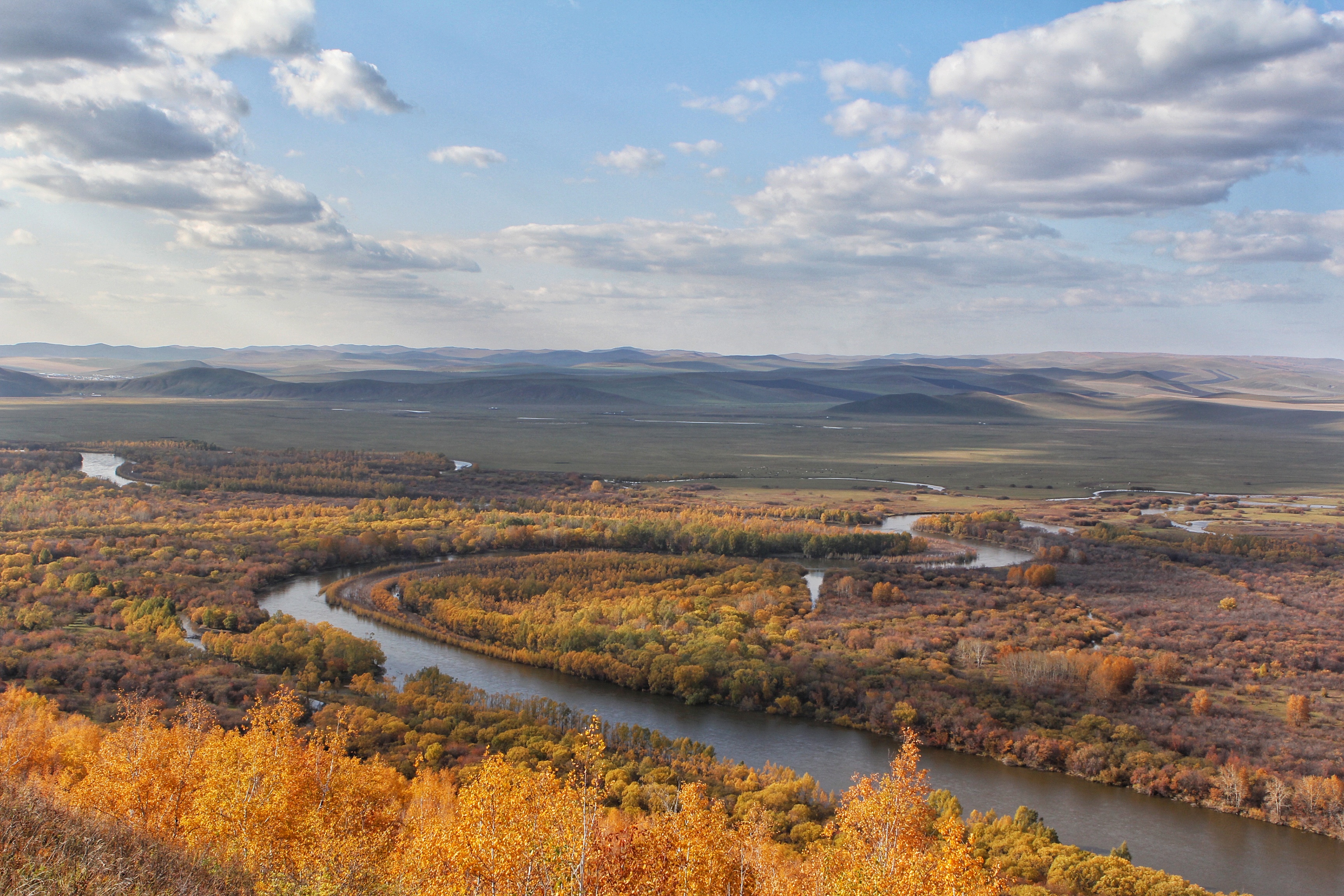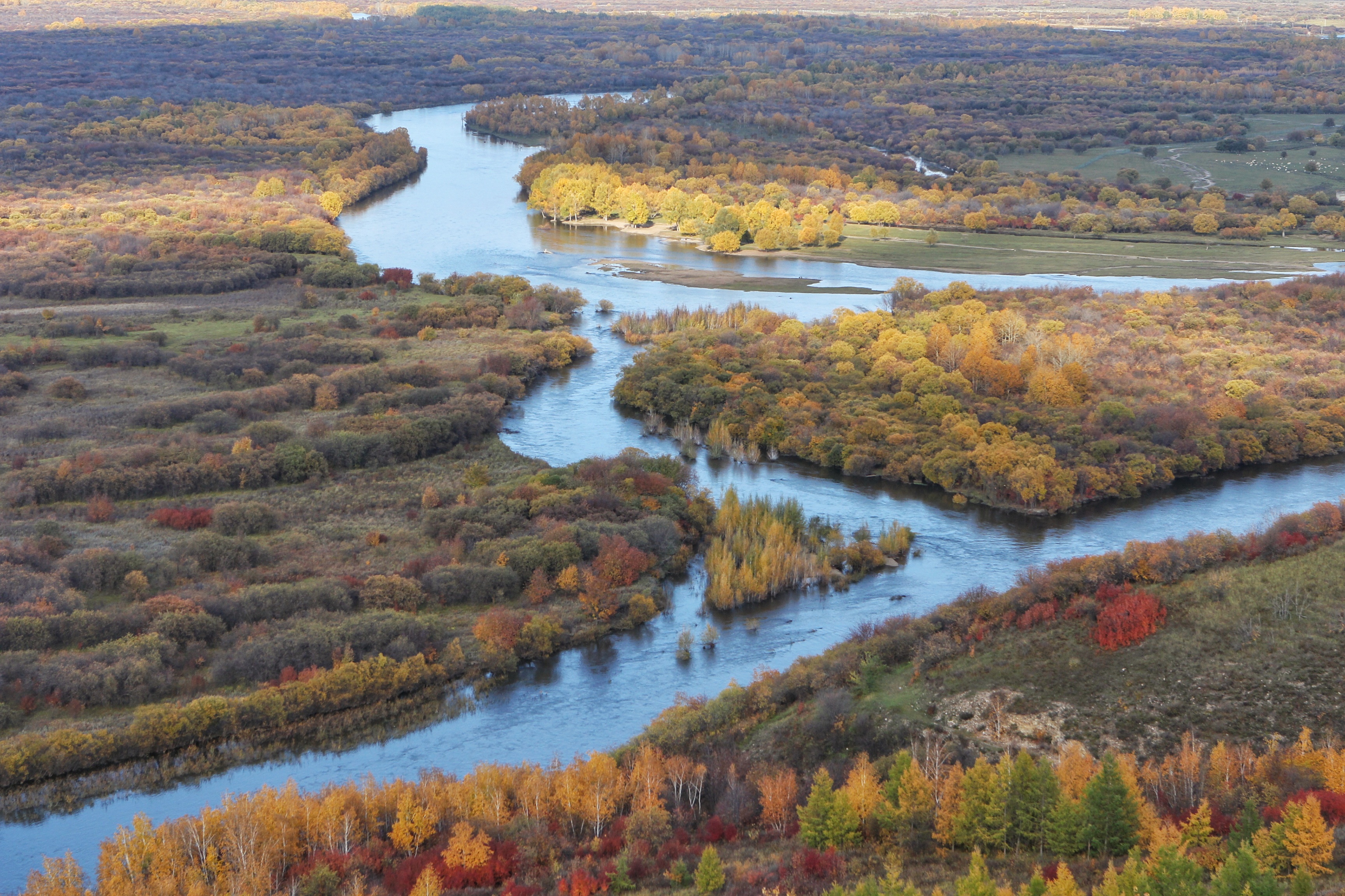 额尔古纳湿地,亚洲第一湿地,根河在其中蜿蜒前进,簇拥着它的是红黄绿的热烈,直至远方。