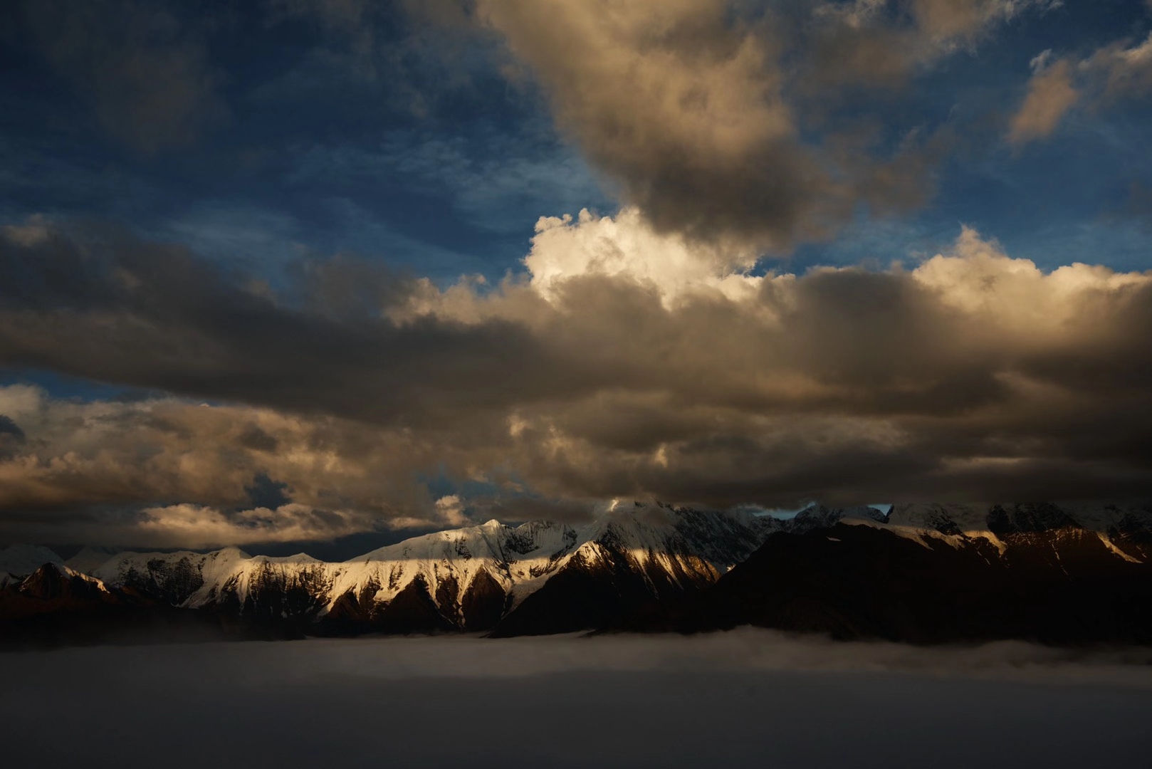 在海拔4500米的子梅垭口,守候贡嘎雪山日落,子梅垭口是贡嘎日落绝佳观赏机位,有机会还能遇到云海和佛光。