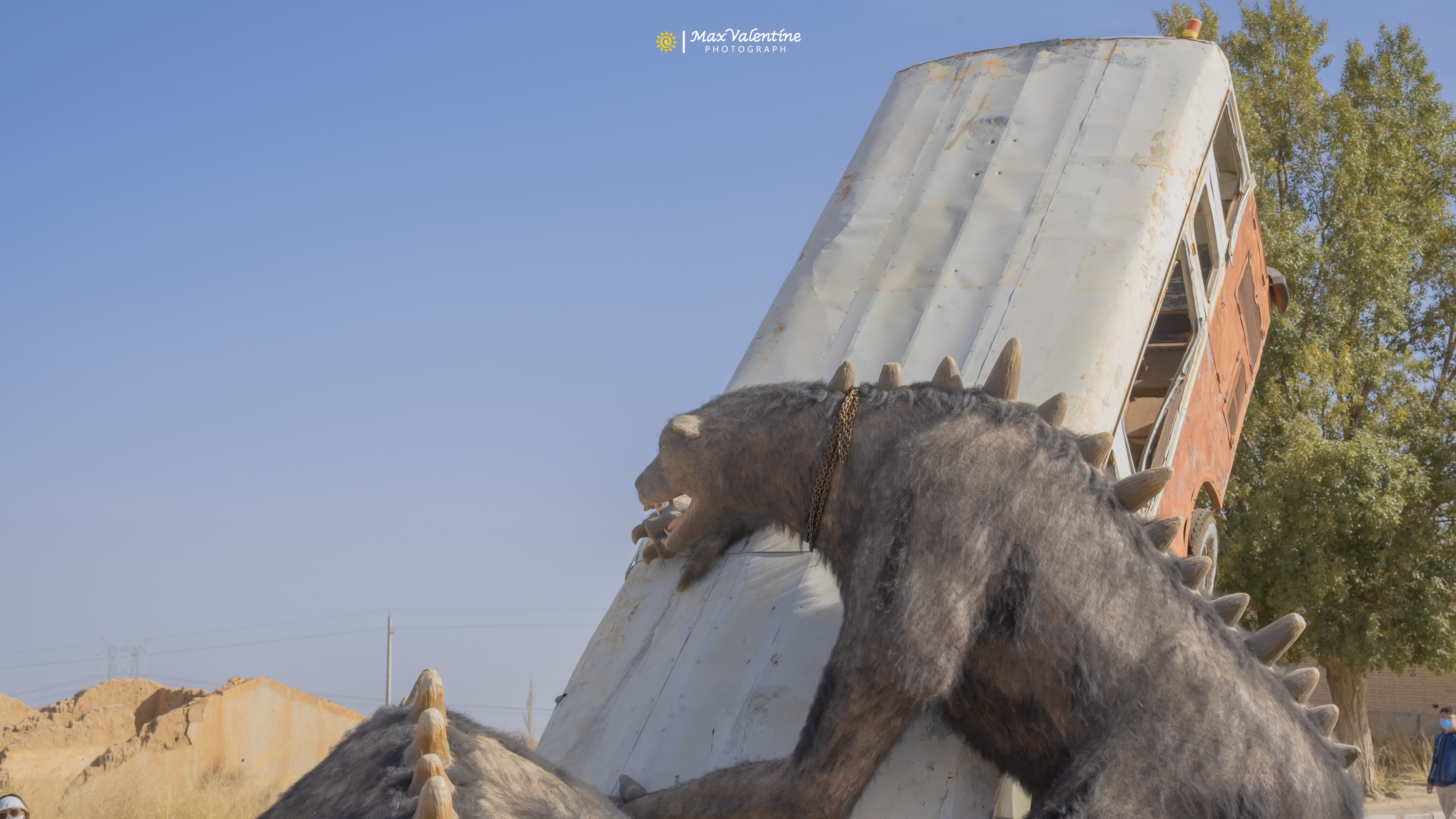仿真的怪兽、坠落的吉普和公交,断壁残垣的幼儿园,荒诞的造景反而感到亲切