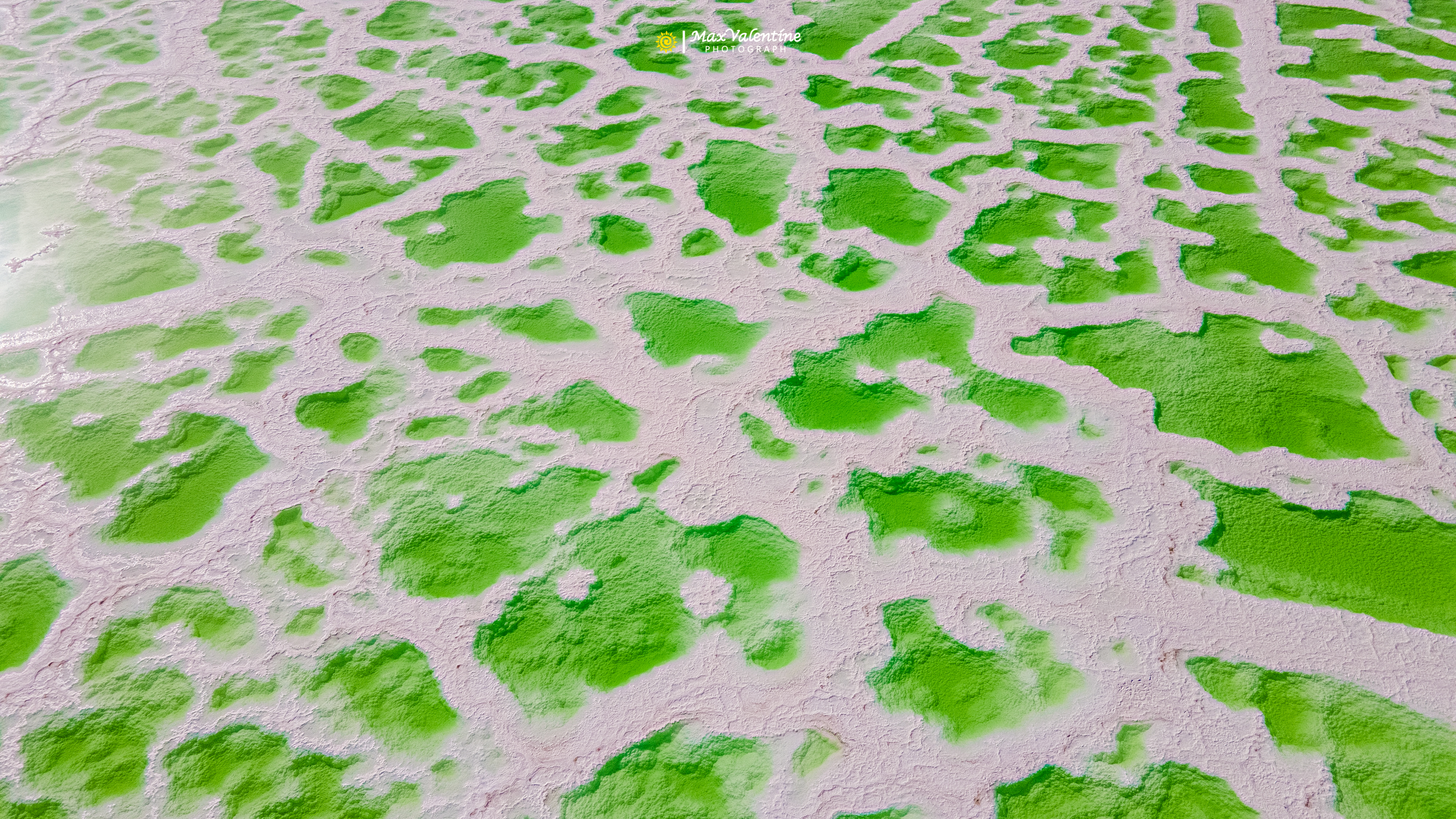 但是和大柴旦的翡翠湖有截然不同的形态,盐田被规整的道路切割,方块内部则是像哈密瓜纹路一样