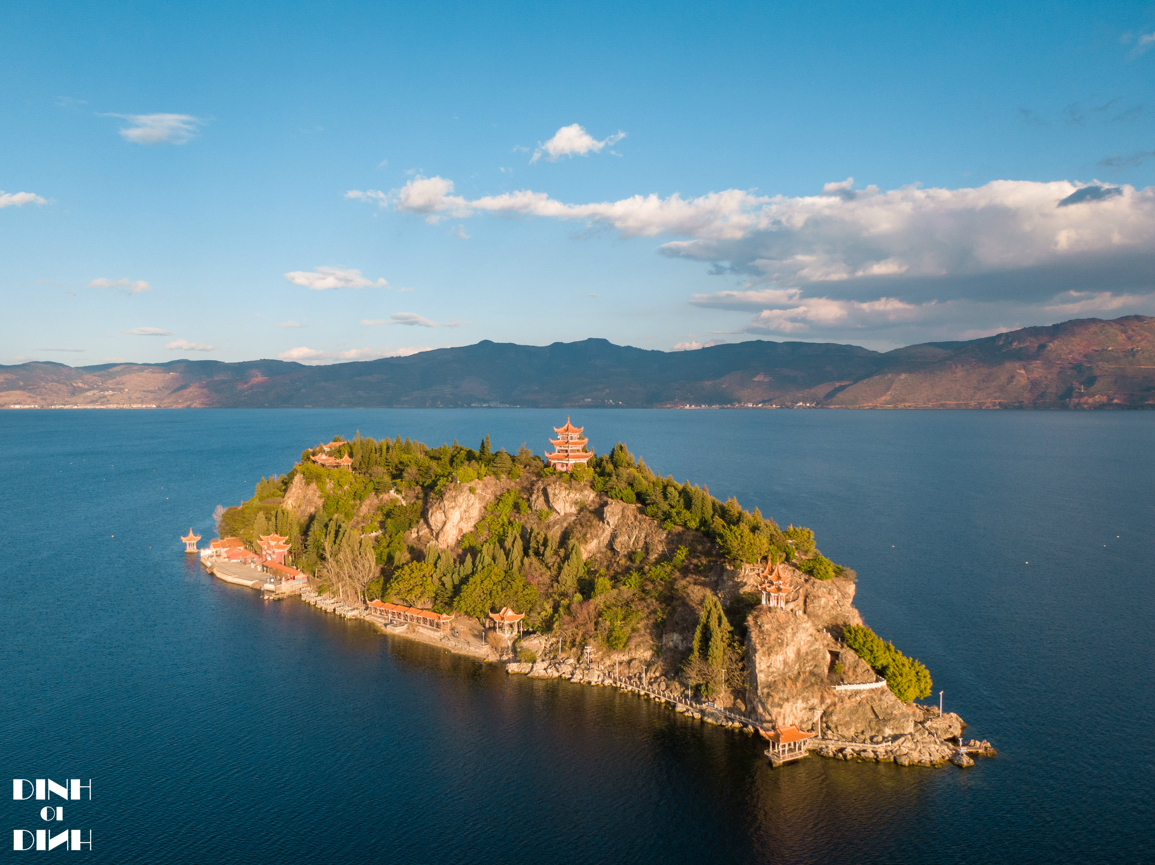 航拍中,在湖面上星星点点的白色都是来过冬的候鸟。像一个个小小的船在湖面上随波荡漾。 云南 的暖冬是它们最喜欢的冬天了吧。冬日夕阳下的孤山,自带温暖的光晕。