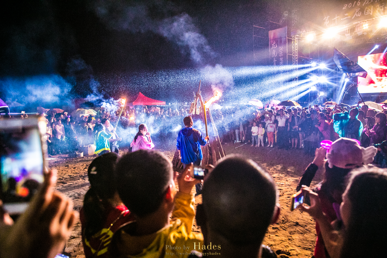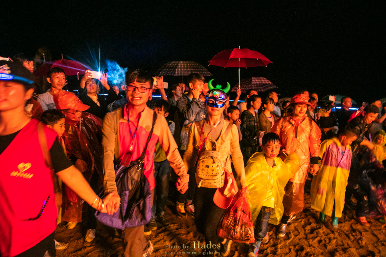 即使天空中仍旧下着雨,也阻挡不住大家如火般的热情!随着火焰越窜越高,参加进来的游客也越来越多,整个沙滩被欢快的人群塞的满满的。