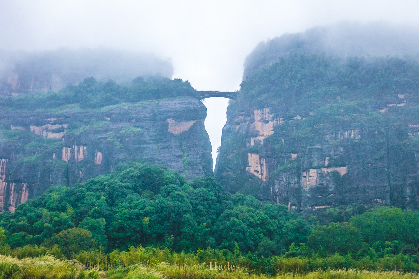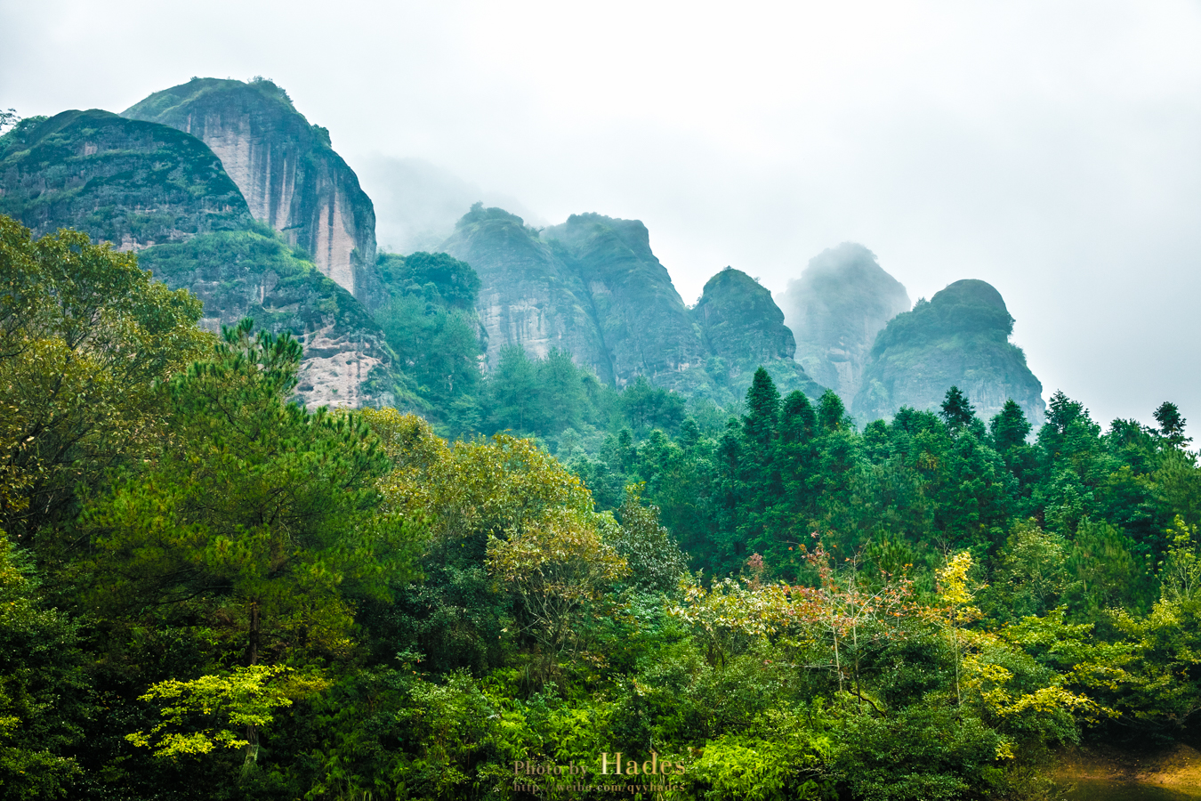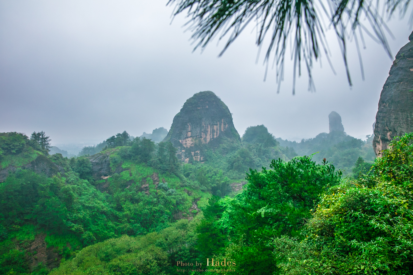 从景区正门乘游览车到上清古镇有半个小时车程。沿途并不单调,有很多美景。只是天气不好,很多山头美景都被云雾遮掩。龙虎山属于典型的丹霞地貌。丹霞地貌标志性的特征就是山体呈赤红色。但一路上所见到的龙虎山山体并不红润,大多呈土黄色或深褐色。经导游讲解才知其中奥妙。
