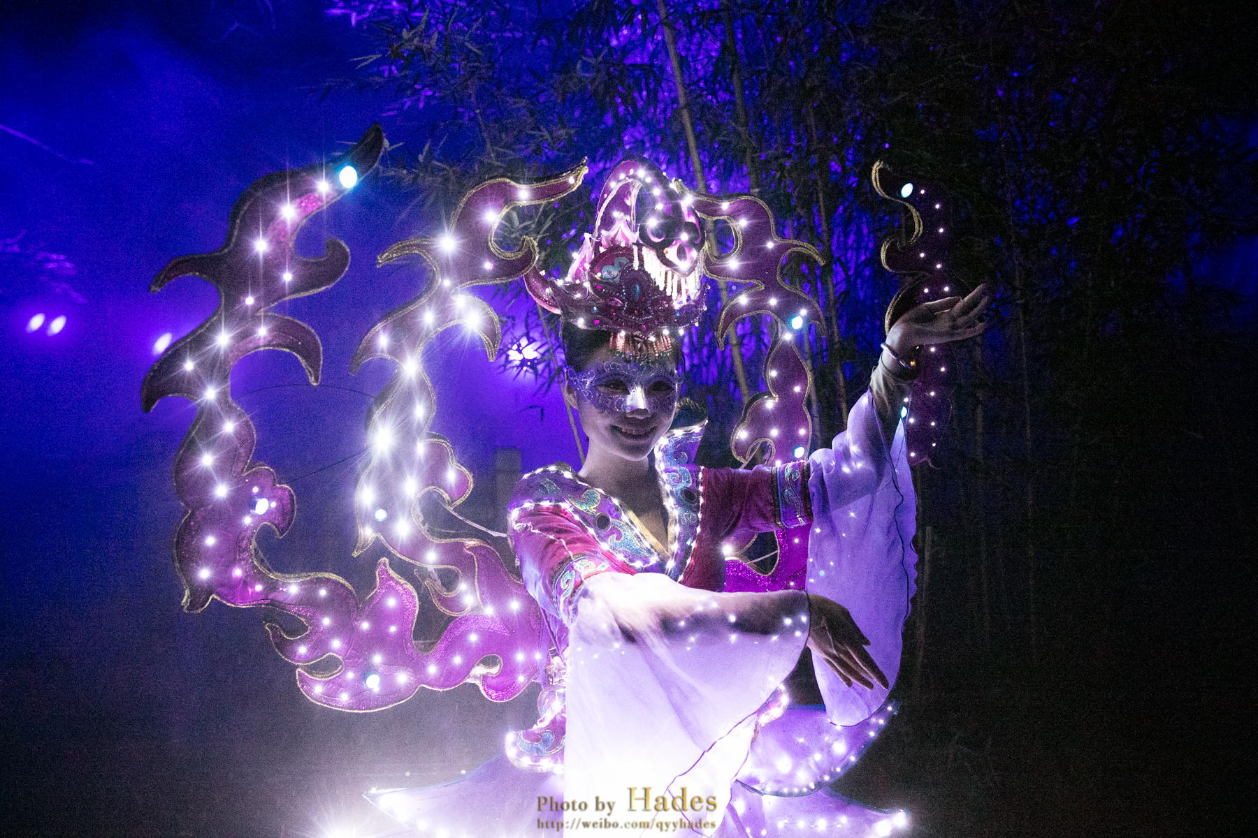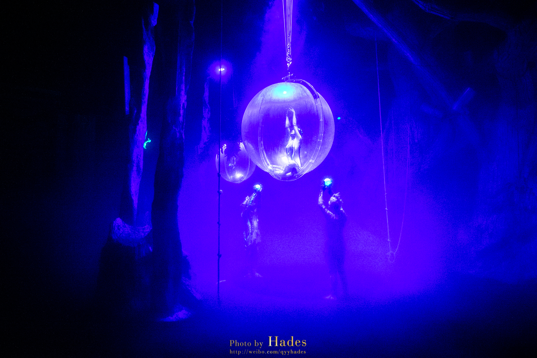 巨大的树木被灯光和烟雾映成了阿凡达般的奇境,巨大的圆球吊在半空感觉好梦幻!拍了好一会,发现这些水晶球和里面的演员全都一动不动,还以为他们只是背景装饰,没想到突然动起来,瞬间便感觉像是科幻大片在面前上演!