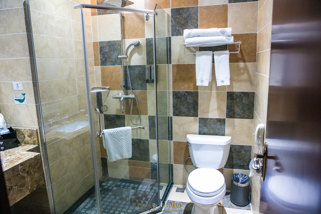 卫生间宽敞明亮,通风较好。卫生间内有音响与电视相连,在卫生间也可以听到电视声音。