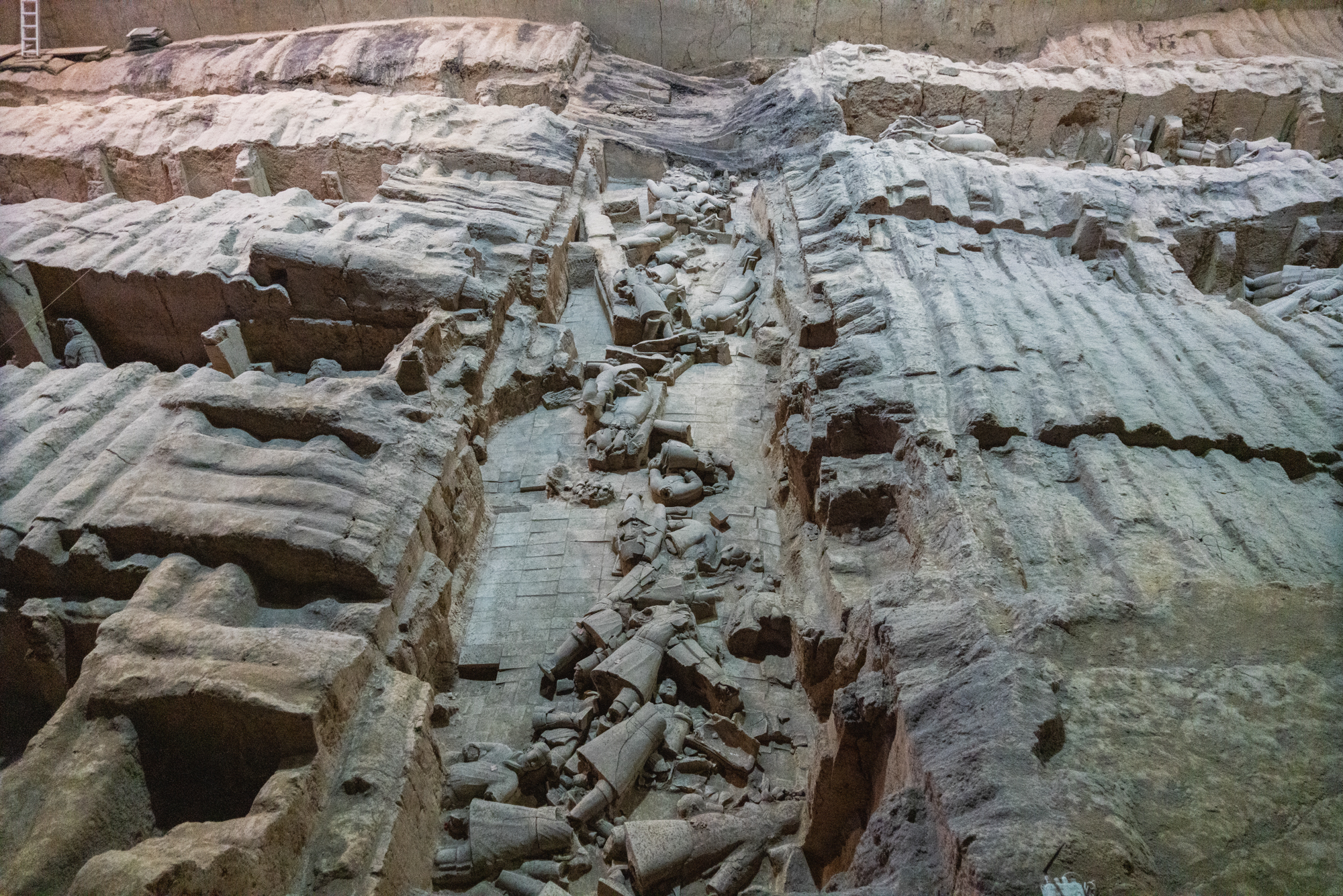 如今馆内共开放三个坑,其中一号坑的规模最大,呈长方形,是一个以战车和步兵相间的主力军阵。现已出土陶俑1000余尊,战车8辆,陶马32匹,各种青铜器近万件。进入一号坑,瞬间一个古代大军阵映入眼前,仿似喊杀震天、战车嘶鸣的古战场正在你面前,恍惚间,仿似这些兵俑已然上阵,他们的使命千百年来从不曾更改。