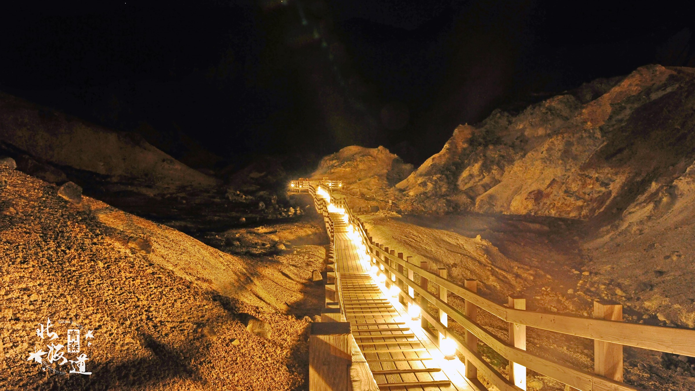 晚上的地狱谷黑漆漆的一片,栈道上点亮了一排灯,延伸到地狱谷深处。我俩扛着相机夜晚出来探险,去的还是叫“地狱谷”的地方,说真的,真挺害怕的。四周弥漫着硫磺的臭鸡蛋味,时不时喷出蒸汽,在黑暗中看不真切,深渊里不知道有什么怪物,一无所知带来的无限遐想,人吓人应该就是这么吓死人的。哈哈哈。幸好,后来走到里面碰到了一对欧美游客在这里拍照摆pose,一瞬间我们的胆子又回来了,开始各种拍照,又是延时,又是趴在地上,忘记了恐惧,拍照拍的不亦乐乎。