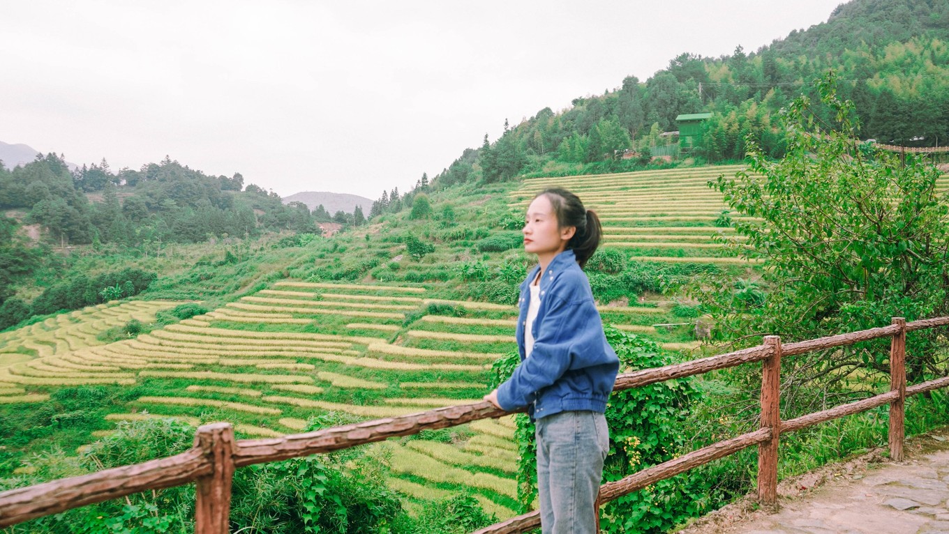 刚好是接近秋收的季节了,旁边梯田上的水稻全部黄了,黄绿交接,煞是应景