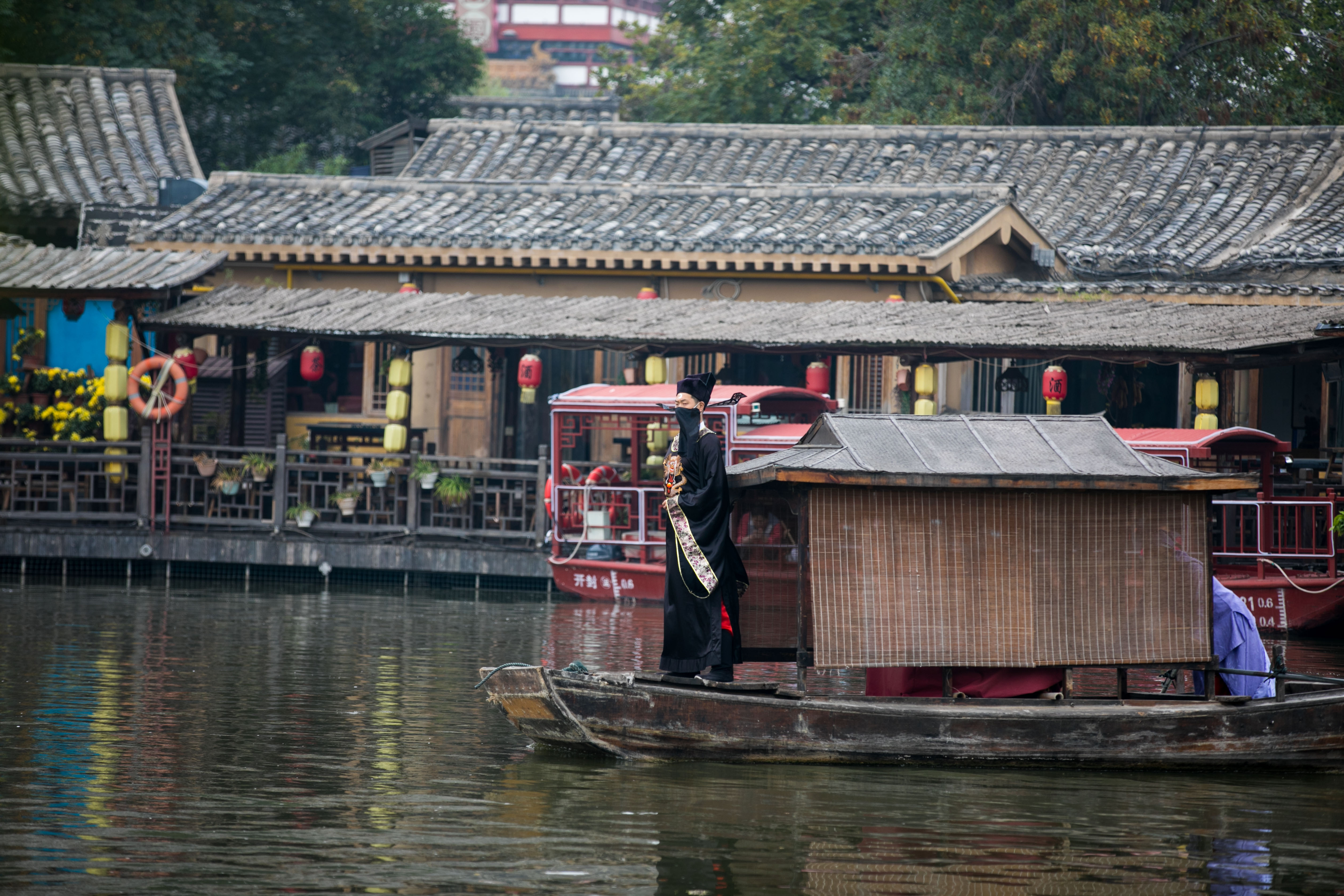 走过虹桥,看碧水涟涟,穿过街道,在这里可以看到穿着各式古装的商贩。