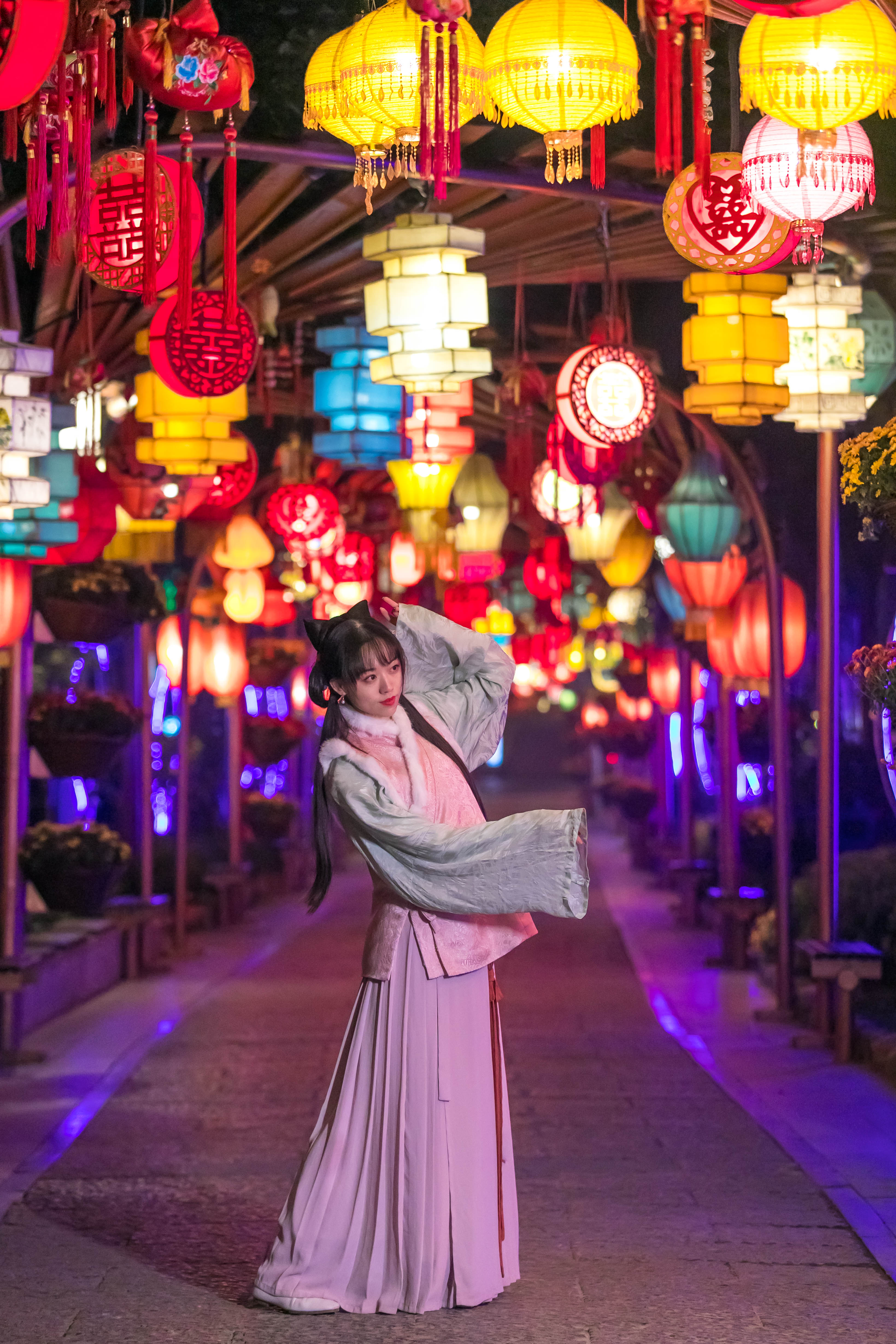 美轮美奂的灯笼,灯光照射下的菊花更加神韵多彩,惊艳了整个夜晚。同行的小姐姐被眼前这一盛世美景所吸引,在花前灯下跳起了舞,真是浪漫,让人如痴如醉!