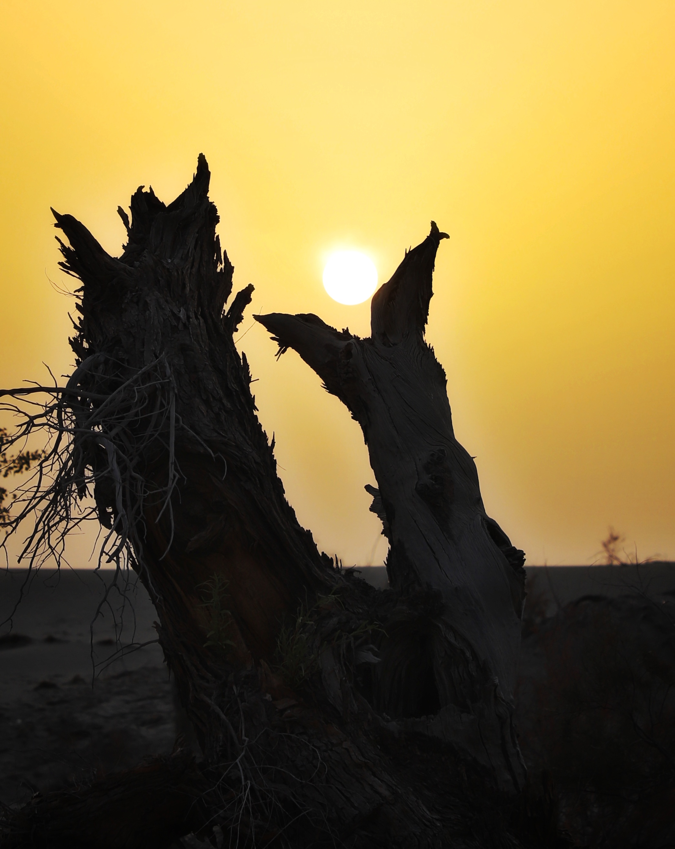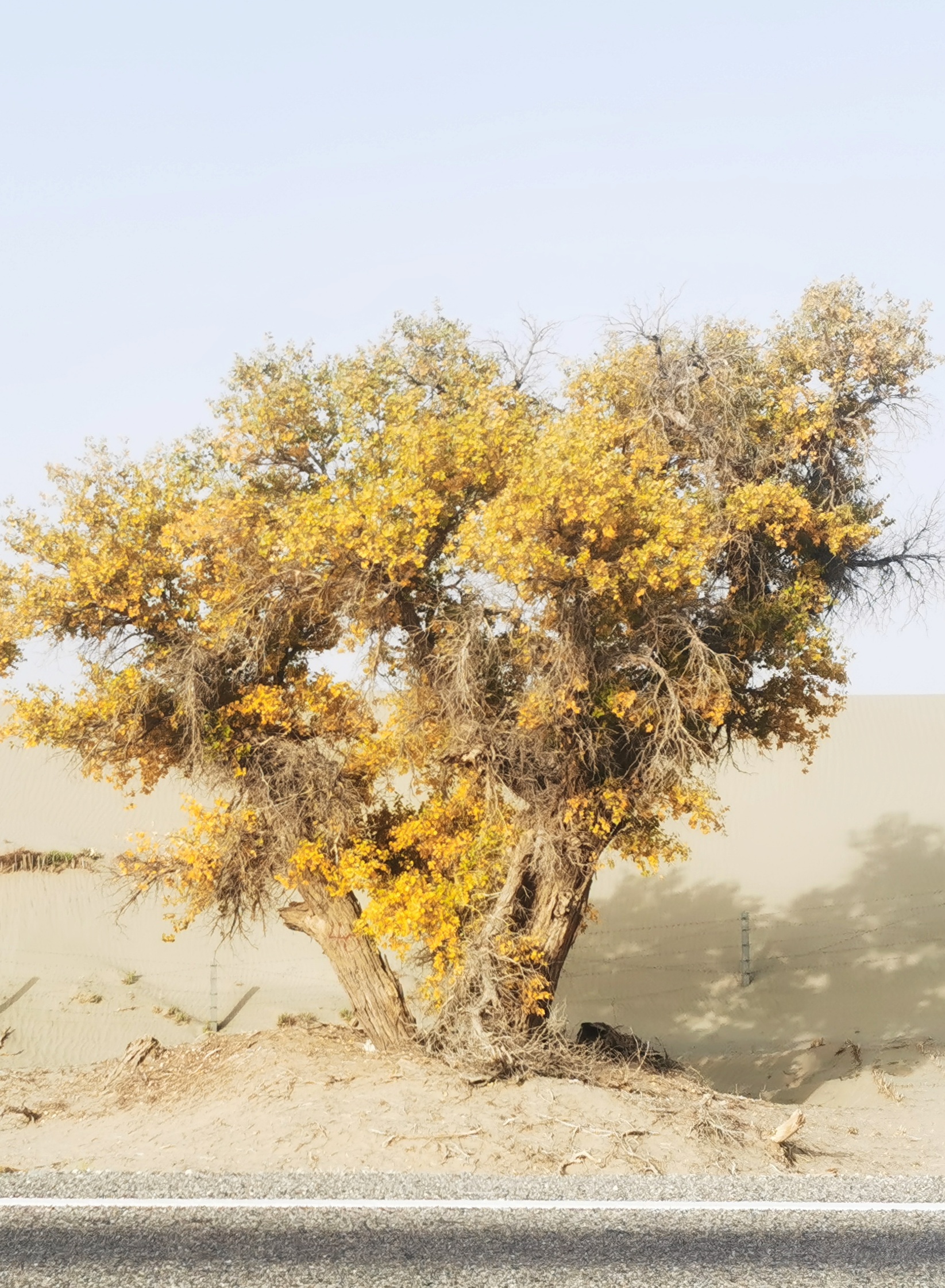 塔克拉玛干沙漠是中国最大的沙漠,亦是世界第二大流动沙漠。乘车于沙漠,犹如泛舟与海洋。行程当日,我们赶在日出前就出发,拍摄日出时的胡杨剪影照。苍劲的胡杨,无际的黄沙,带给人们无比震撼的力量。扬起一把细沙,对着太阳的方向,细沙在阳光的照射下变得金黄,沙粒飞舞间,是时光的痕迹,岁月的留念。