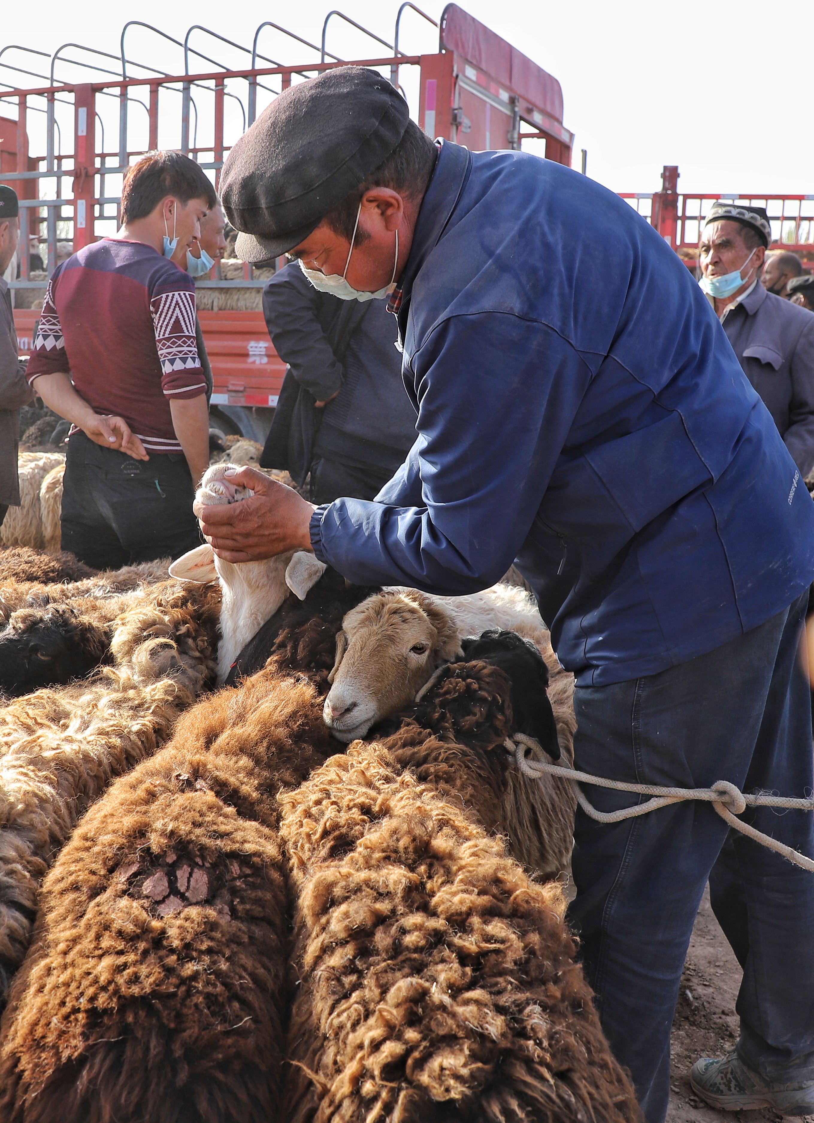 喀什牛羊大巴扎--位于喀什郊区,只有每周日开市,是最原汁原味的交易市场,也是南疆最不可错过的人文画面。牧民们带着自家的牛羊前来交易,在成千上万的牛羊群中,最壮观的交易场面也在这里展开。整个大巴扎尘土飞扬,场面混乱壮观。一般只需看看牛羊的牙齿,摸摸屁股,双手托起来抱抱,最后袖管里谈价成交。但是现在这种古老而神秘的“袖子里交易“已不常见,基本以现金交易为主了。