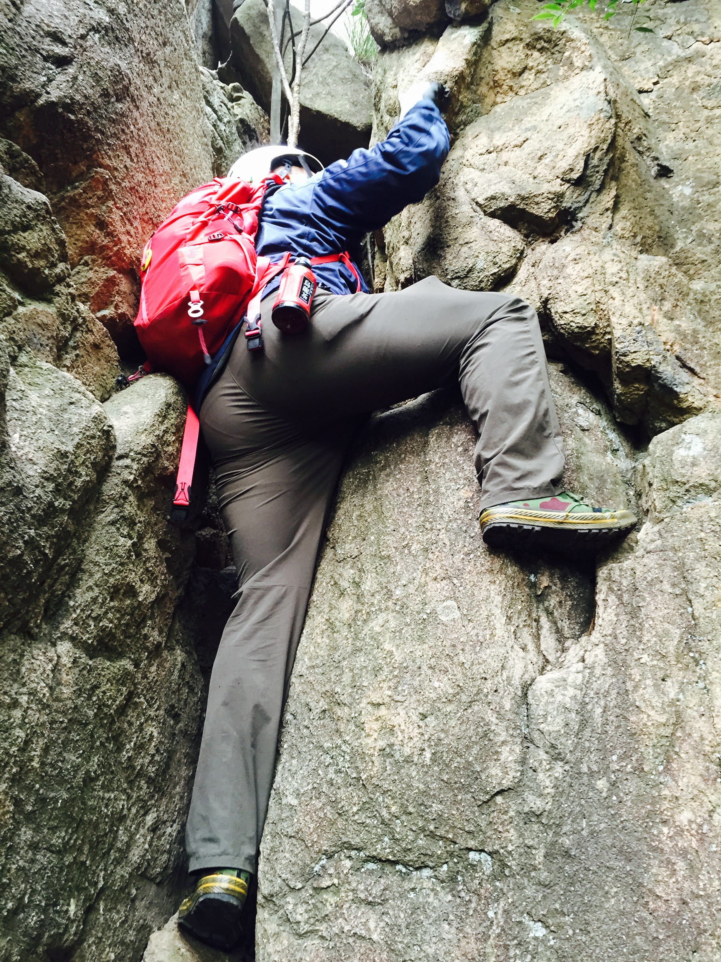 走一段崖壁间小道,来到第二第三处放绳攀爬的地方,先是一大段之字形直壁上行,然后接一小段石头攀爬,这里的一大段之字形直壁上行落脚点还是很舒服的,有把握的可以不用绳,直接徒手上去,保证爽歪歪的。