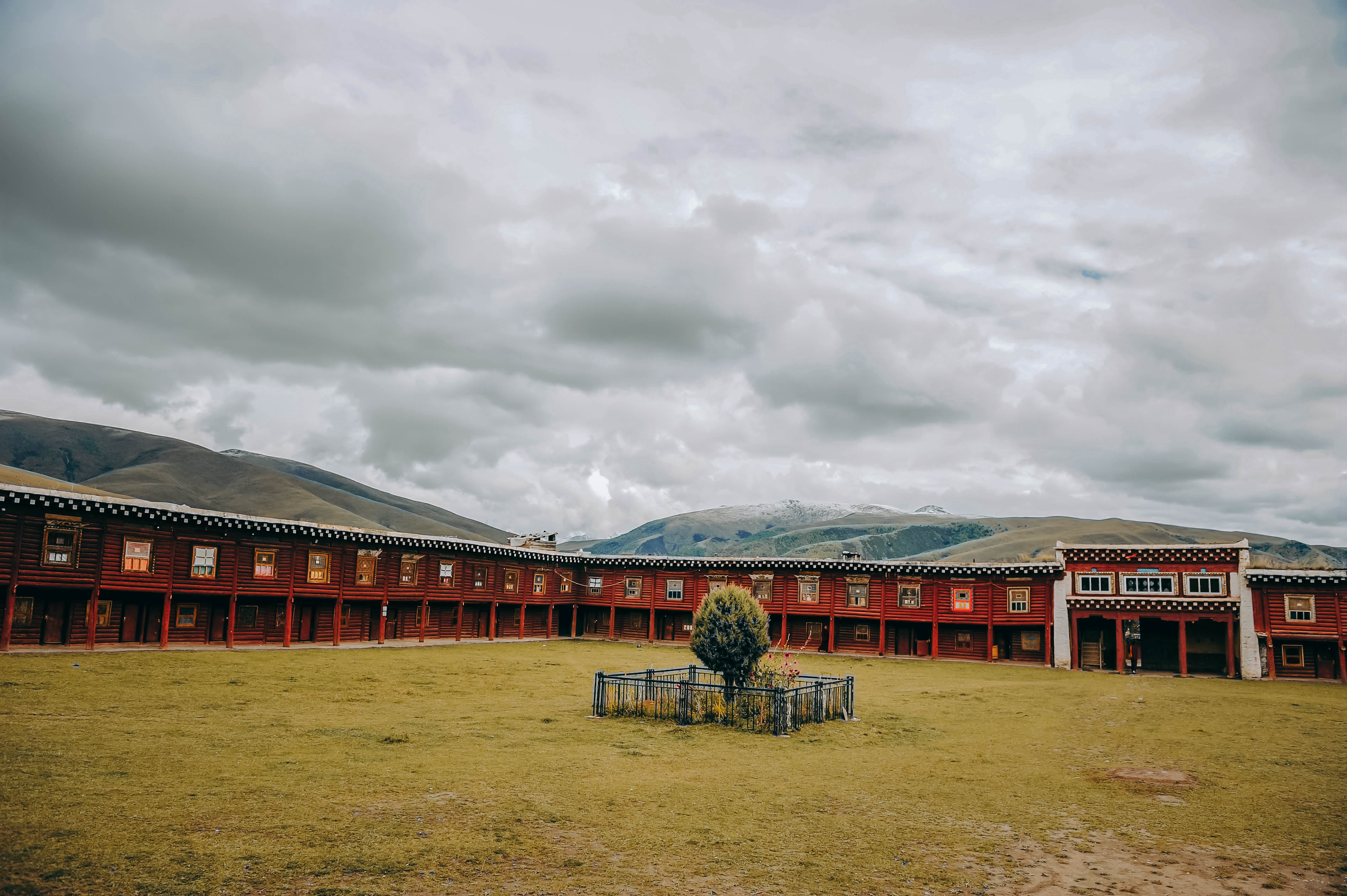 居里寺建在山坡上,游人可以入寺参观,和新都桥的其他地方一样,喇嘛们所住的宿舍也是红顶白墙的碉房式结构,上下几层,一字展开。寺中的殿宇宙建筑布局颇为紧凑,沿着山坡从下到上次第排开,走到最高处的殿宇平台,能远远地望见新都桥的原野和山峦,和掩盖着山顶的低低的云。