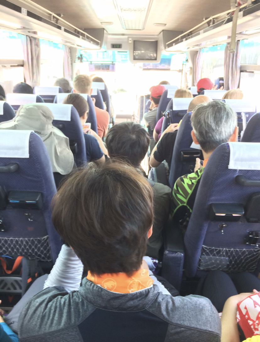选择了当天早上6点40分从河口湖到五合目的第一趟班车。原以为人不会太多(前面说过,很多人都是下午才上山),结果一辆大巴居然坐得满满当当,轮到我前面两位时已经满座。花白头发的司机过来鞠躬说着什么,我以为是让我们等差不多一小时后的下一班,结果却是因为要安排我们坐过道中间的加座而抱歉。顺利上车!