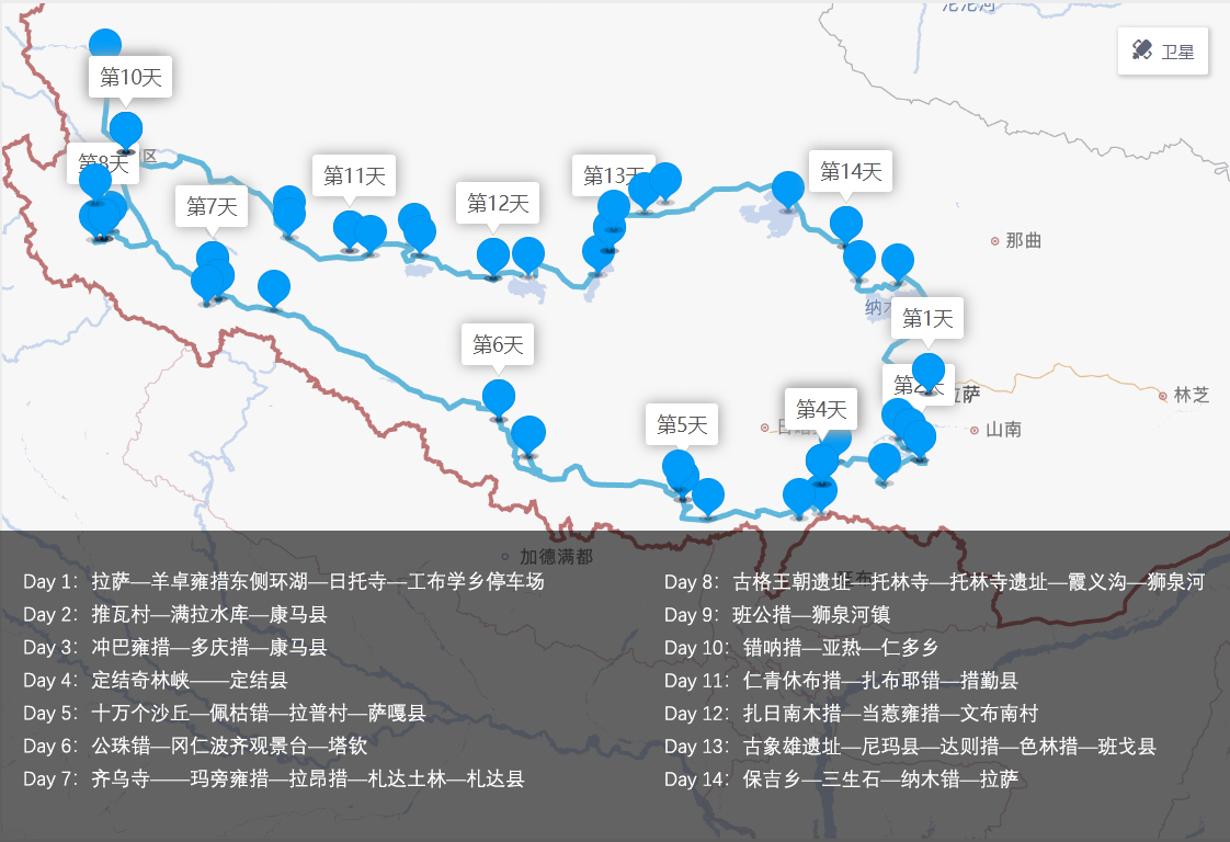 拉萨 出发一路向西,经羊湖东侧环湖、看最孤独寺庙日托寺,去海拔最高的行政村推瓦村,过满拉水库、冲巴雍措,去定结领略喜马拉雅地裂奇林峡的神奇。混入佩枯错湖畔的藏族小村,让他们的纯真浸染心灵。经 萨嘎 去塔钦,看“宇宙世界中心“神山之首 冈仁波齐 ,圣湖玛旁雍措和”鬼湖“ 拉昂 措。再到扎达追寻300多年前的古格王朝,探索他们一夜消失的秘密,看大自然鬼斧神工的霞义沟土林。继续向西在班公湖与水鸟嬉戏。东去仁多,看牛奶湖错呐措,经历魔鬼搓衣板路,正式开启最难最颠簸的 阿里 中线。看盐湖扎布耶错,扎日南木措,在文布南村探秘曾经的巅峰王朝古象雄 和美 极一时的当惹雍措,领略藏地原始的无人区风貌,在这里你会看见藏野驴、白臀鹿、藏野兔,土拨鼠。接着北上尼玛县,独看色林措的落日晚霞,从 班戈 到保吉乡,感叹三生石的三生情缘,以及纳木错北岸的绝美海岸线,以及念青唐古拉和纳木错的绝美爱情传奇,接着南下从 当雄 返回 拉萨 ,至此14天旅程结束。