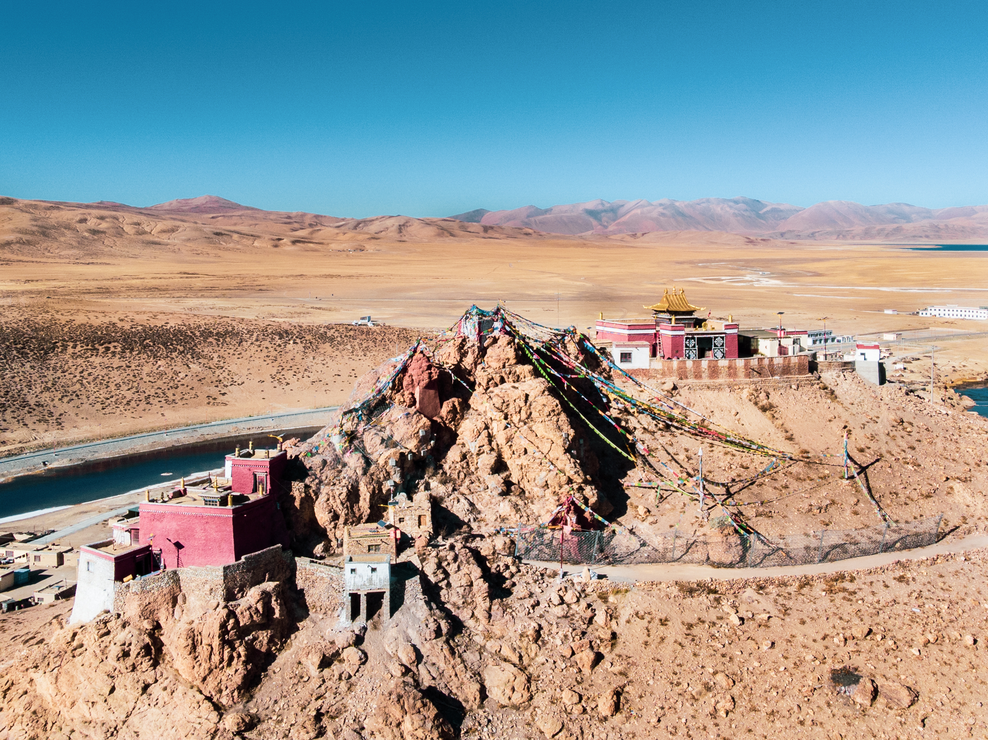 从航拍上看,日托寺就像是一位睿智老僧守着这一方世界尽头,而羊湖仿佛 天水 ,洗净这世界的所有纷扰。犹如仓央嘉措的诗词意境,你守着大千世界,而我守着你。